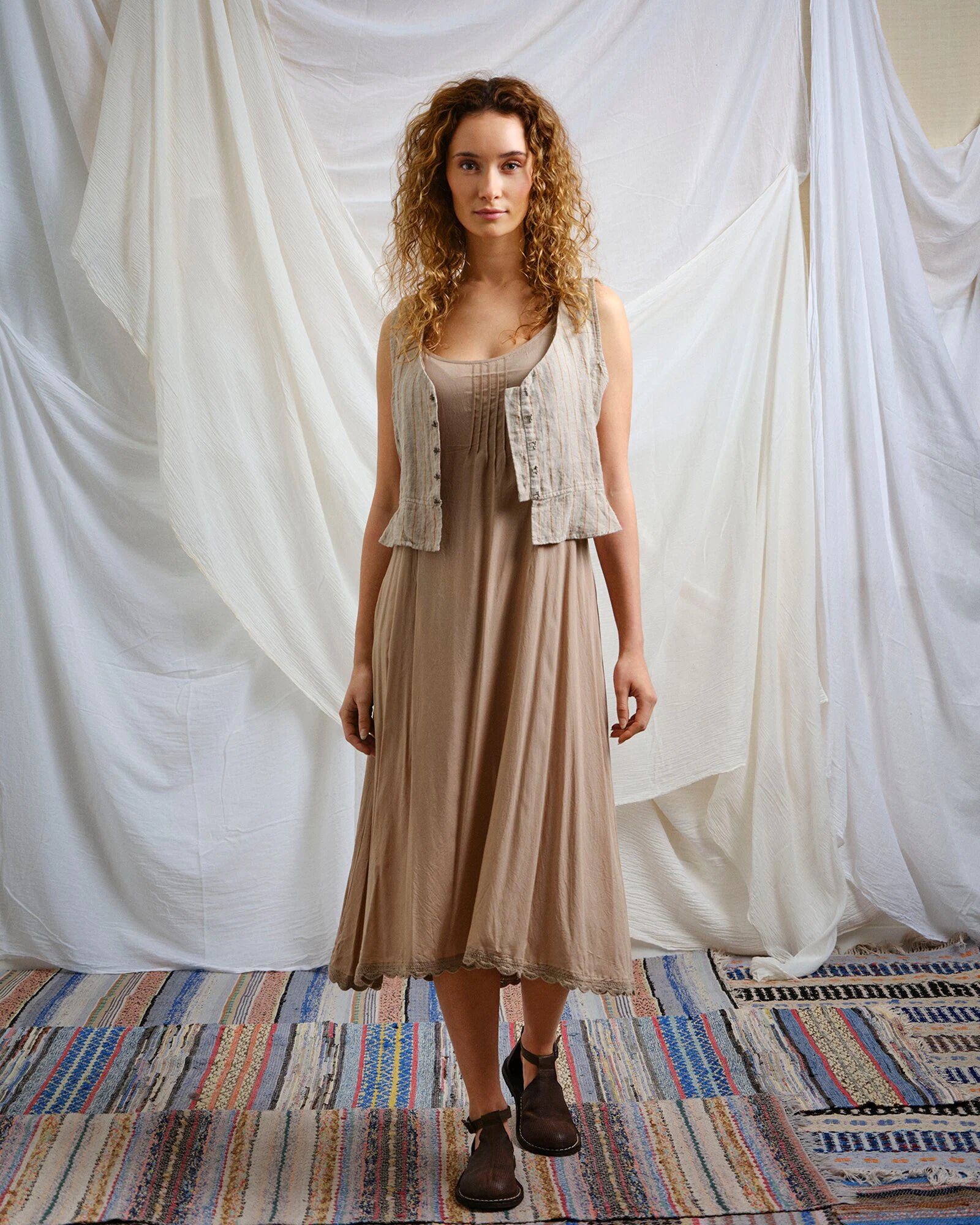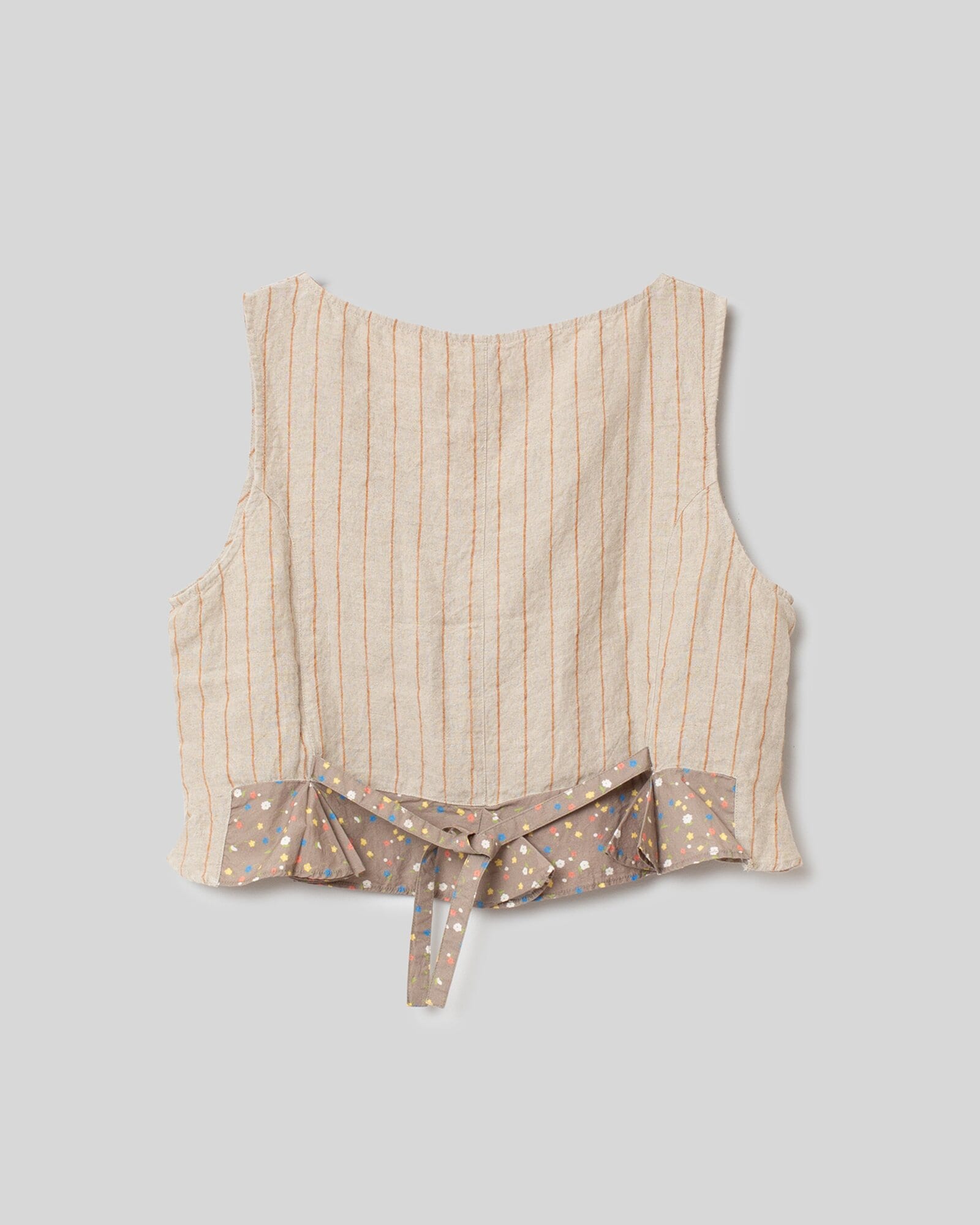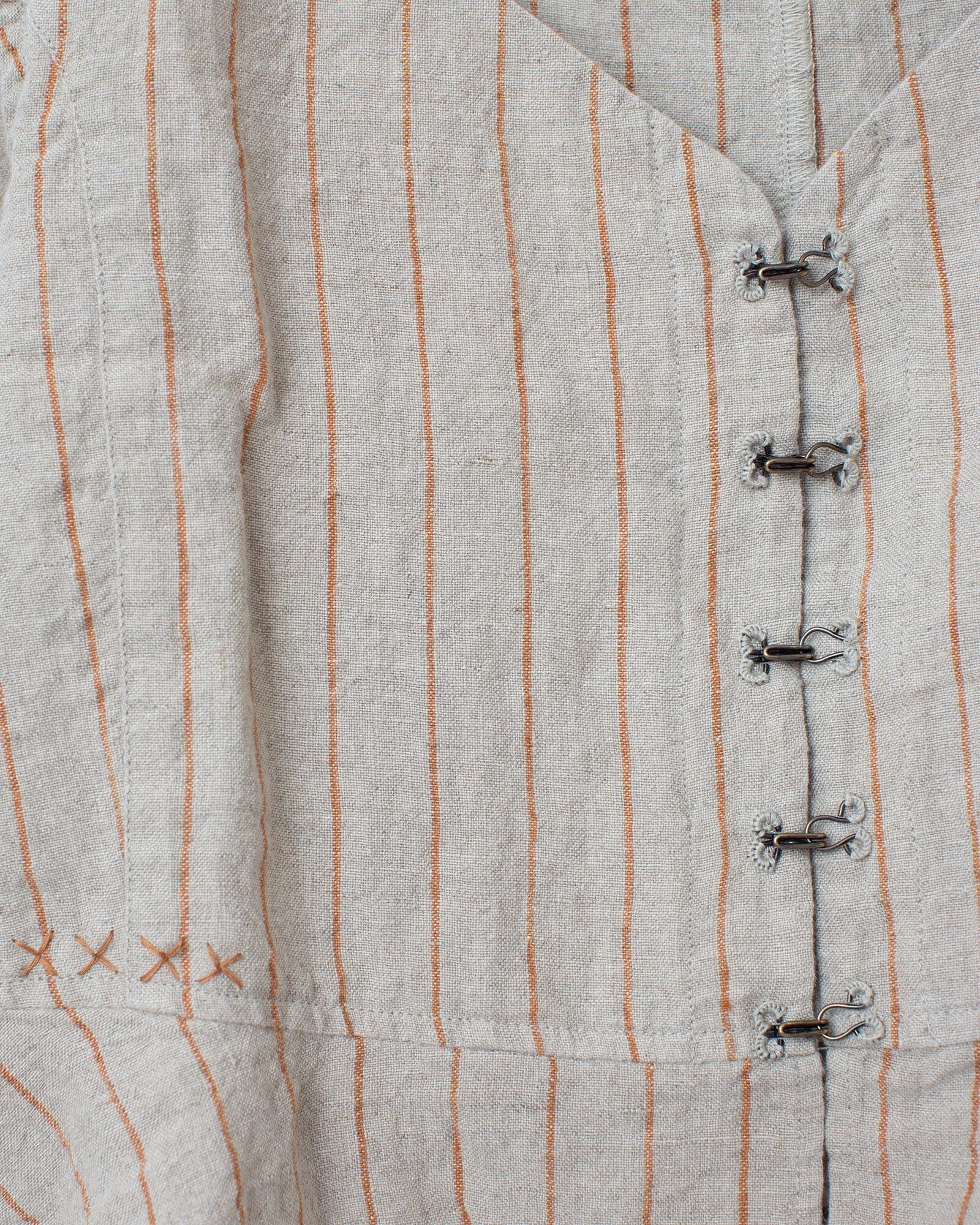 Vest in pin stripe linen with hook and eye at the front. Ties and sewing detail at the back in beautiful small-flowered cotton.