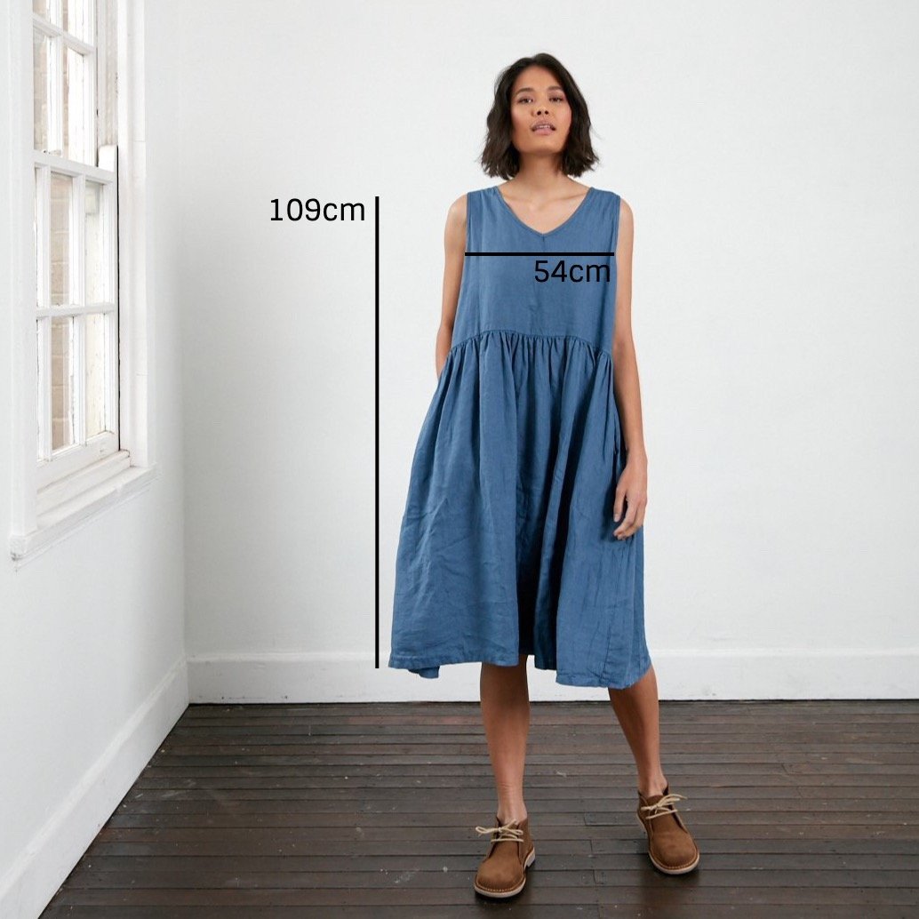 The perfect choice for hot balmy days paired with a chunky leather sandal, or layered with a fine knit, tights and boots for winter. Our sleeveless linen smock dress is cut from a soft European 100% linen and features 2 side-seam pockets and v-neck. Gathered under the bust, it drapes beautifully to create a feminine silhouette.