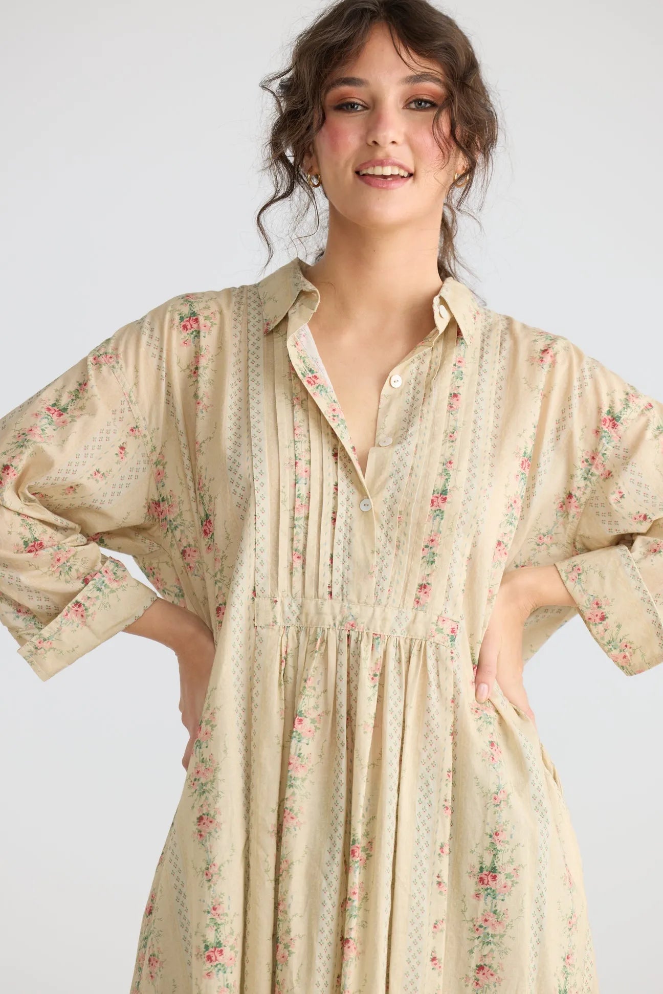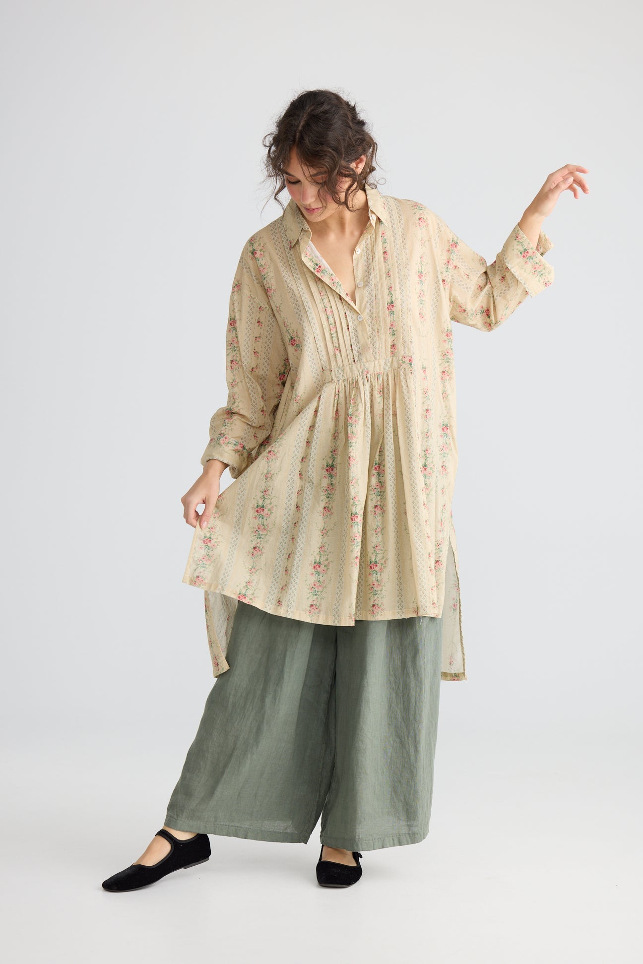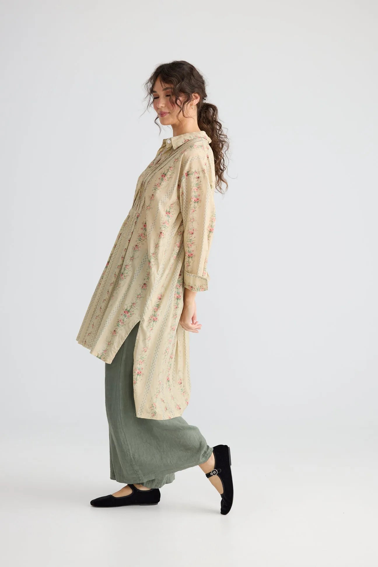 Annabella is a classic . Cut so that it flatters any shape with its longer back and shorter front, lovely pin tuck details on the bodice and lightweight cotton printed in one of our signature vintage French florals. Annabella is a stylish casual shirt which can be thrown over a pair of jeans, skirt or pants. The beautiful colours in the tiny roses and stripes will mean it will match just about anything.