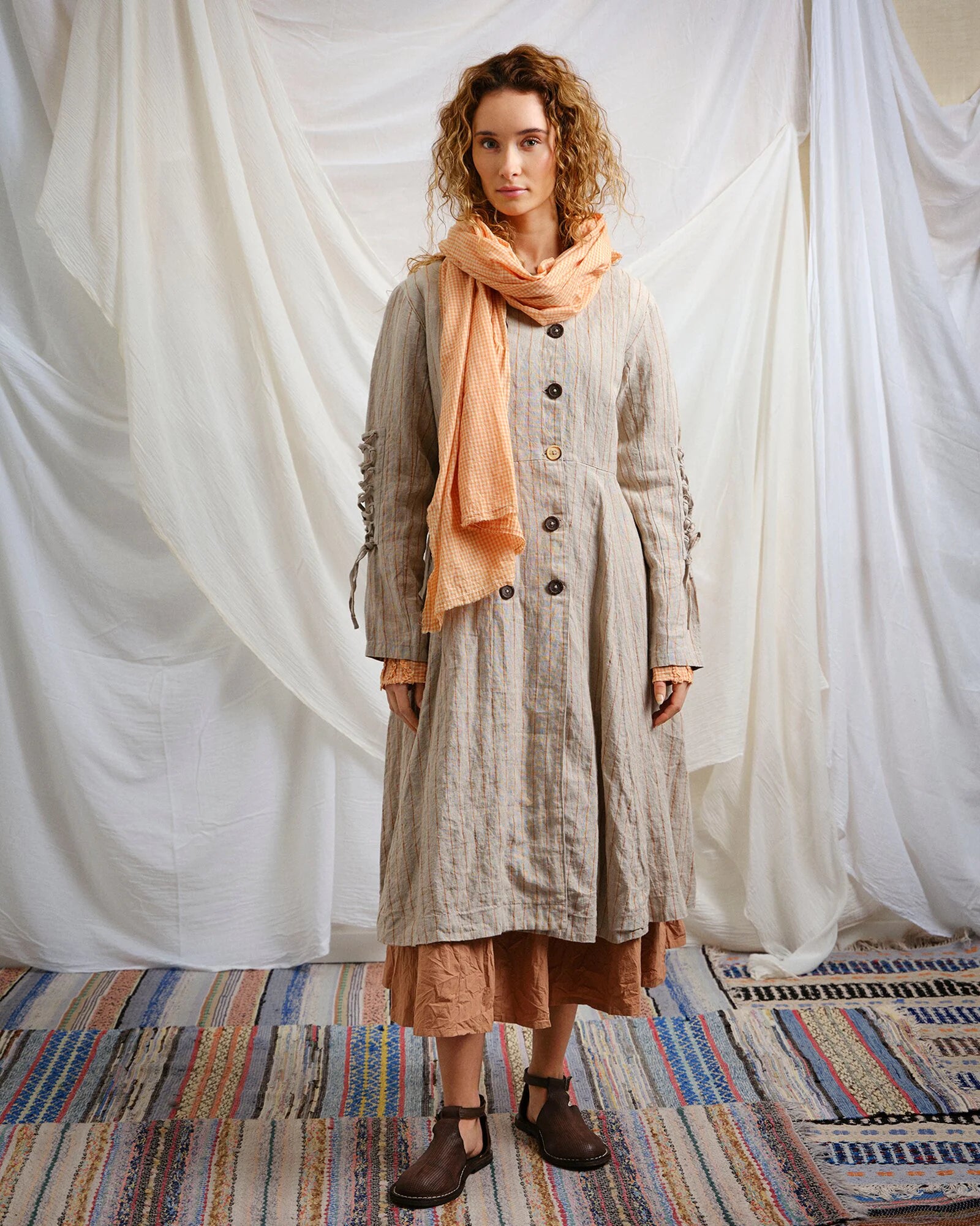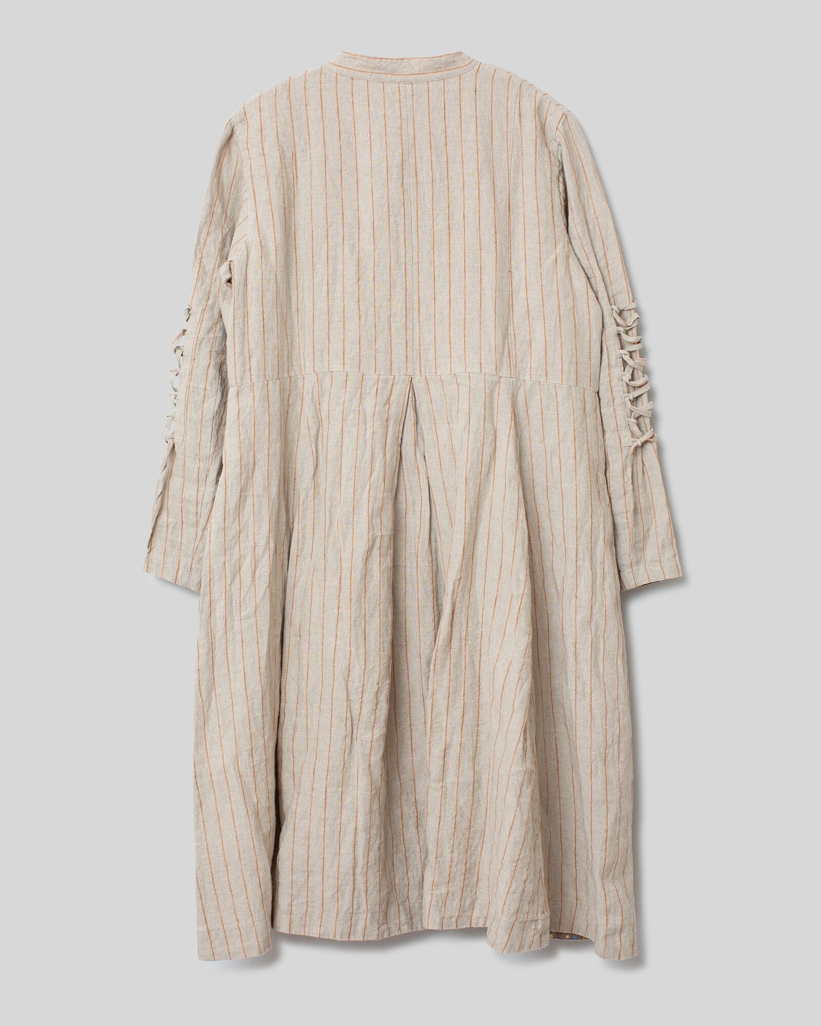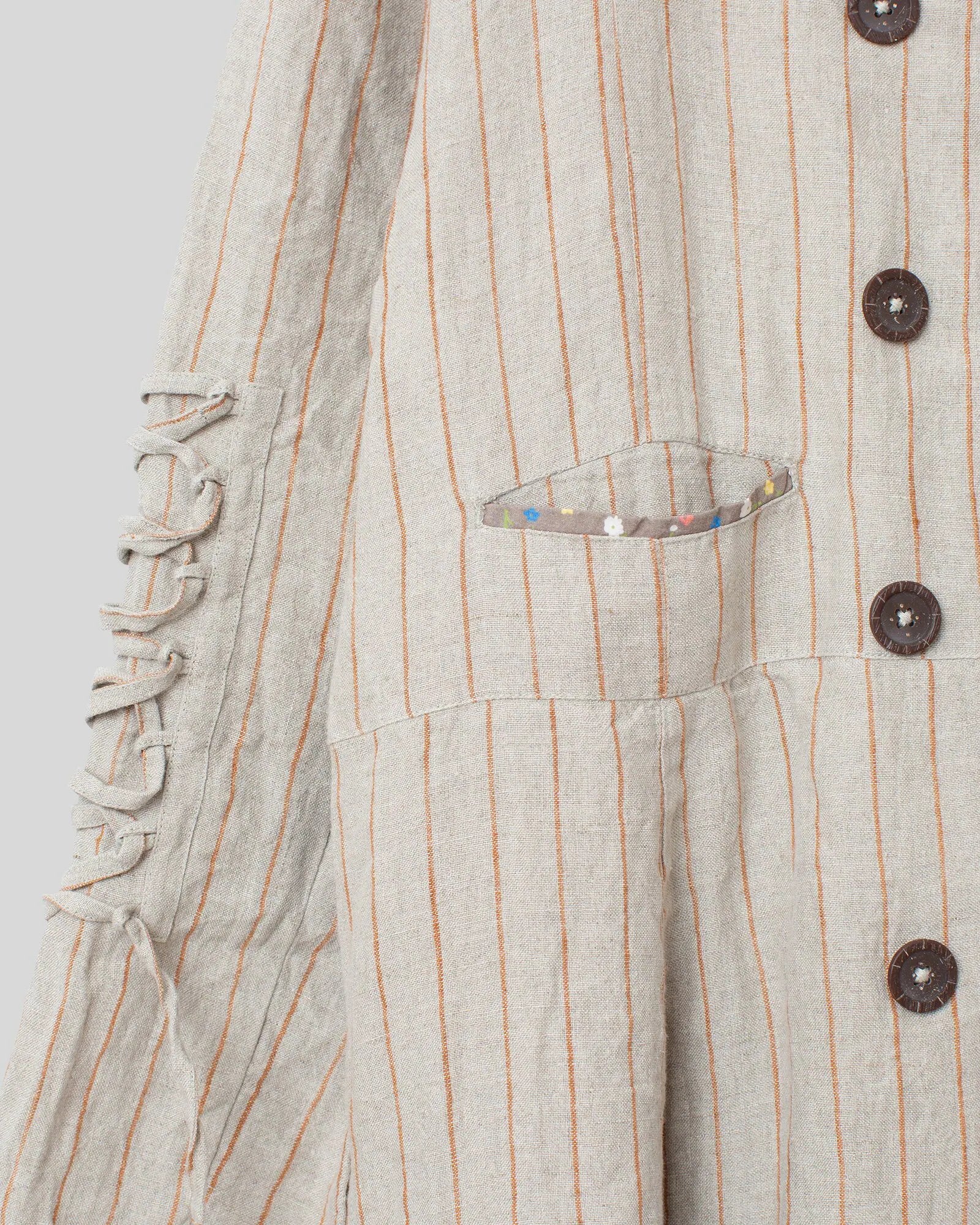 Coat in pin stripe linen with a stand-up collar and buttoning at the front. Decorative lacing details on the sleeves. Welt pocket in front and pockets in the side seam. Box pleat in the middle of the back gives the skirt part a lovely volume.