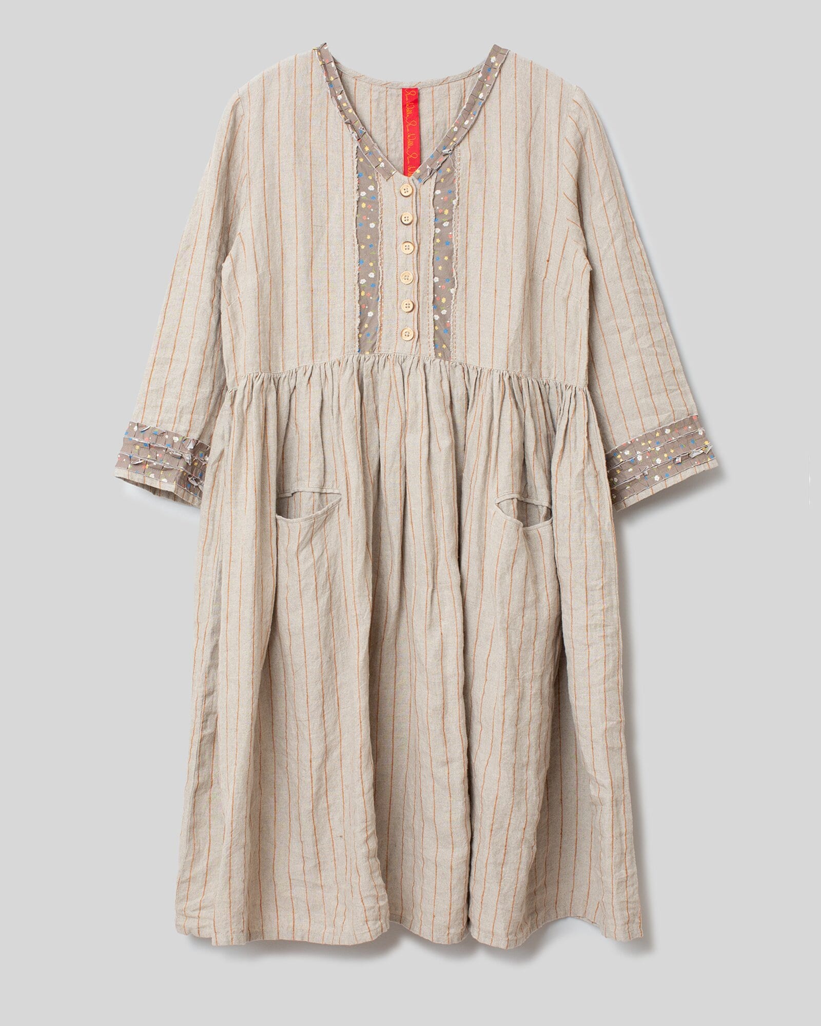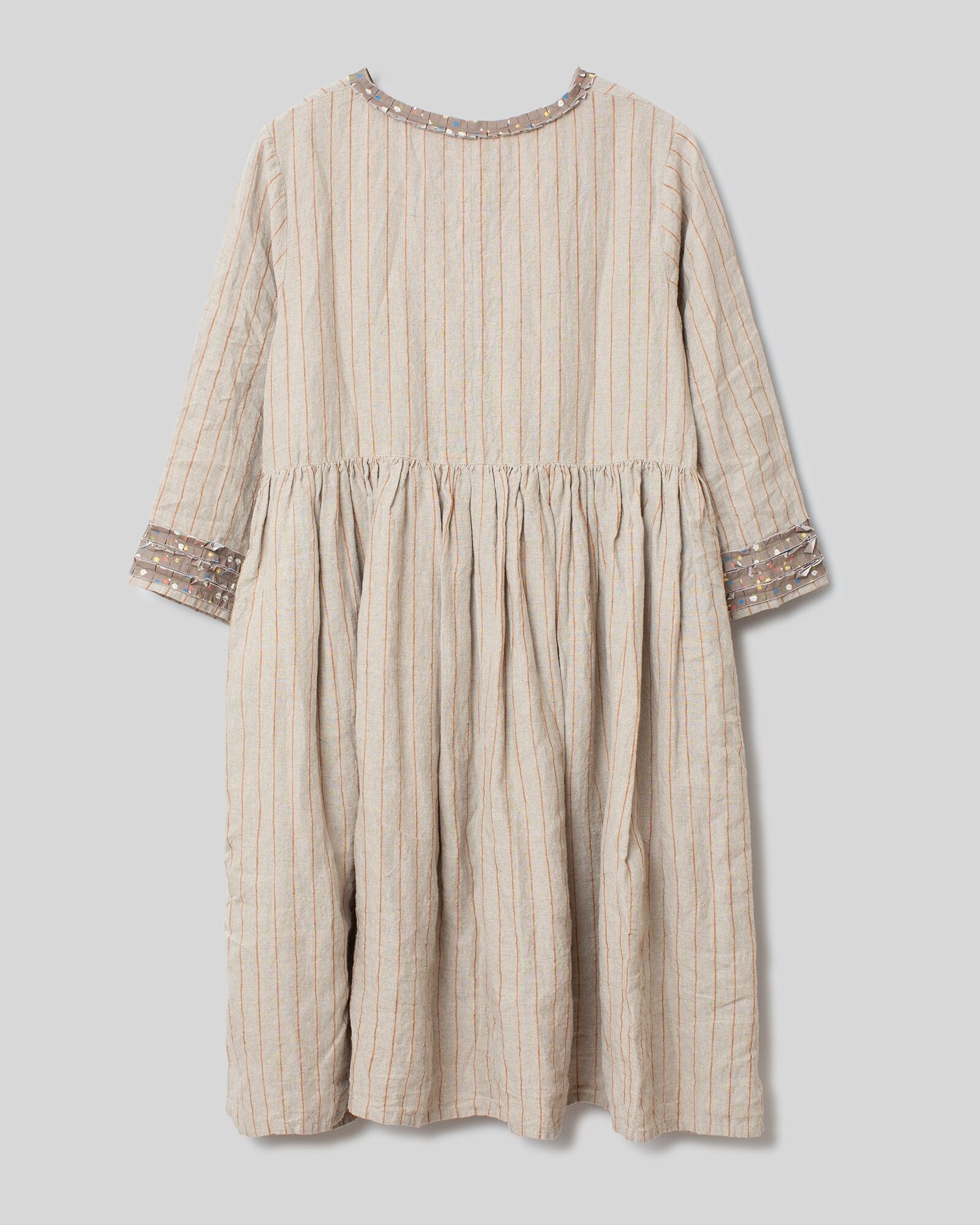 Knee-length dress in pin stripe linen with three-quarter sleeves and ruffles in small-flowered cotton. Buttoning and more details with floral cotton at the front. Wrinkled from the waist and welt pockets at the front.