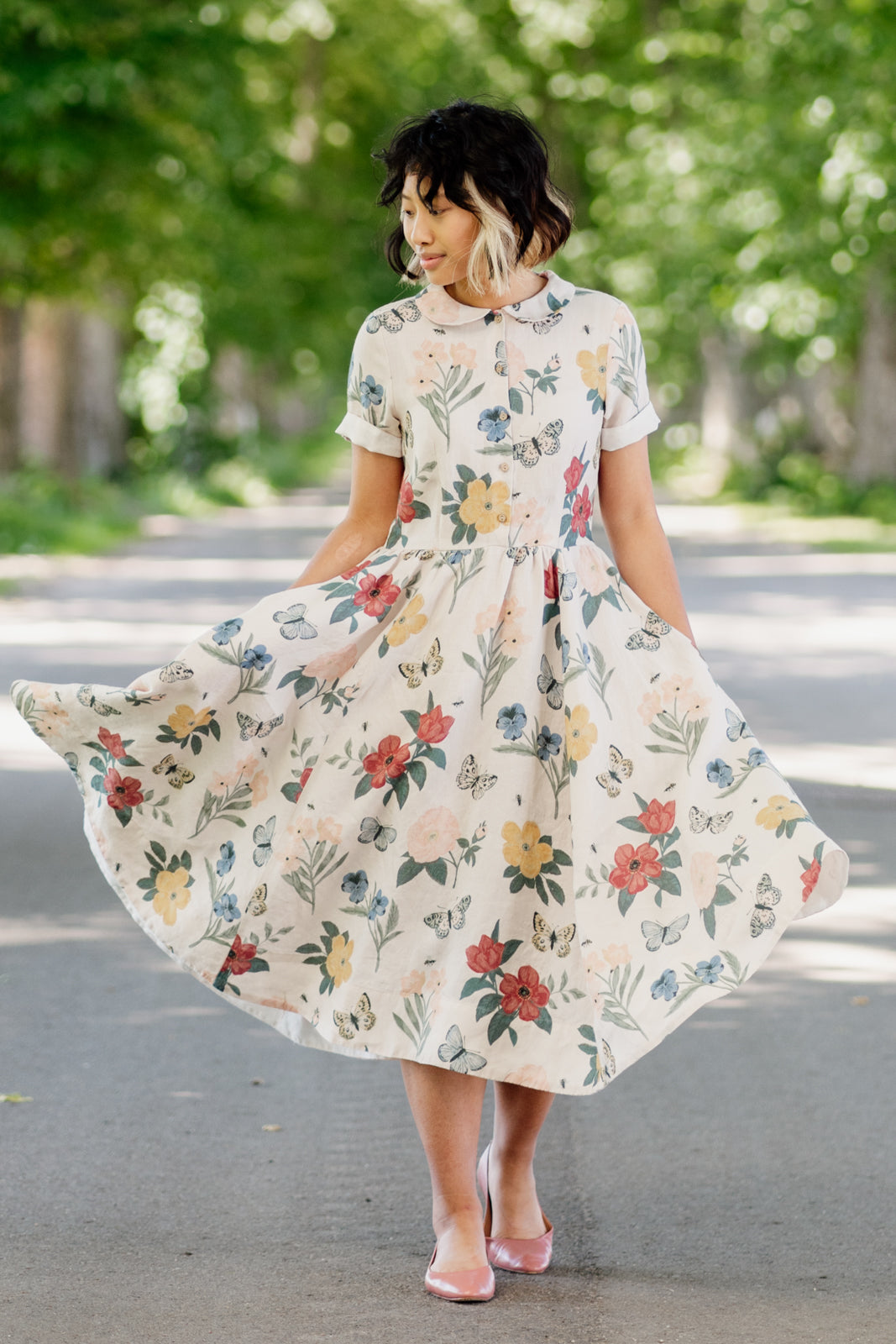 Description SS22 Summer Flowers pattern created in cooperation with illustrator Cassidy Demkov. If you imagine a dress you could wear for any occasion with only one choice left to make - matching the right pair of shoes - it would be a classic cut linen Son de Flor dress. Made of soft linen, our Classic Dress with Peter Pan collar is a complete outfit and is sure to become a wardrobe's darling. The full skirt falls in a flattering A-line shape, has a concealed side zip, two side seam pockets and thoughtful white inside finishing. A-line romantic skirt is an invite for a nostalgic dance. A dance that is full of history. May this dress brings to life your lovely dreams and each time wearing brings a fairy tale with a happy ending! Design features: Please use our Virtual Fitting Room & Measurement Chart to choose your best size. Model’s height 168 cm / wearing size S For custom orders contact us at info@sondeflor.com. Find more details about custom orders here. Made from 100% linen, pre-washed & softened. The garment will not shrink after washing at home. Please use low-temperature water and natural laundry detergent for washing your linen garments. Do not bleach nor tumble dry. Avoid dry cleaning. Set a low heat on the iron to remove unnecessary wrinkles from the inside out.