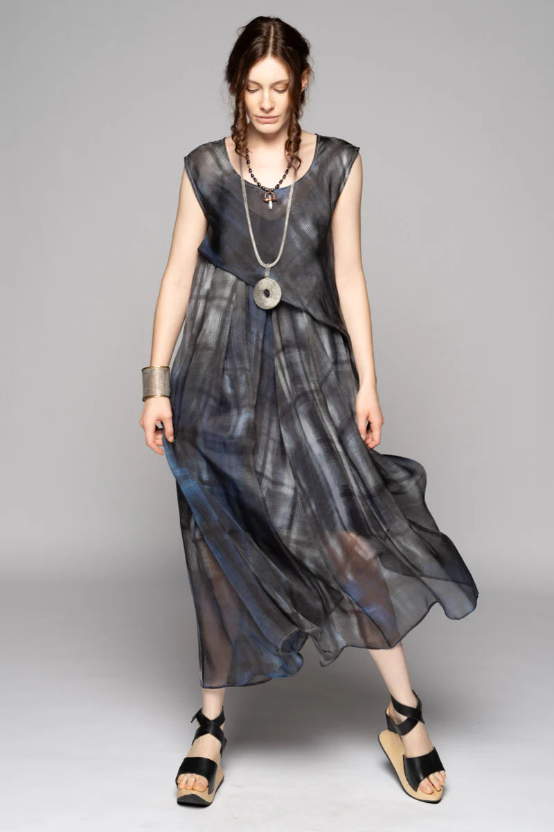 A cloud of printed silk that moves like shadow and light. The Gisella Dress drapes with quiet grace—soft checks dissolving as the fabric skims and sways. Hidden loops and ties let you sculpt the silhouette: wear it long and languid or lift sections into gentle folds for a more artful shape. Ethereal yet easy, it layers beautifully over a slip for luminous depth.
