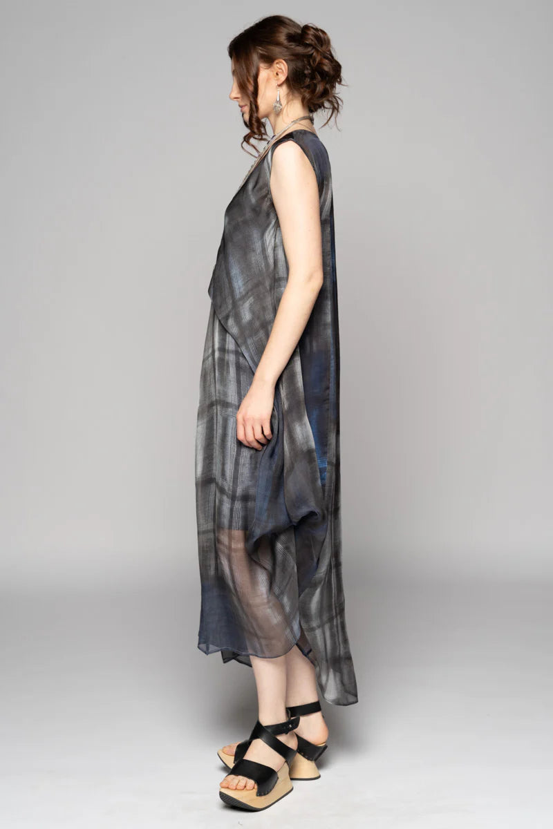 A cloud of printed silk that moves like shadow and light. The Gisella Dress drapes with quiet grace—soft checks dissolving as the fabric skims and sways. Hidden loops and ties let you sculpt the silhouette: wear it long and languid or lift sections into gentle folds for a more artful shape. Ethereal yet easy, it layers beautifully over a slip for luminous depth.
