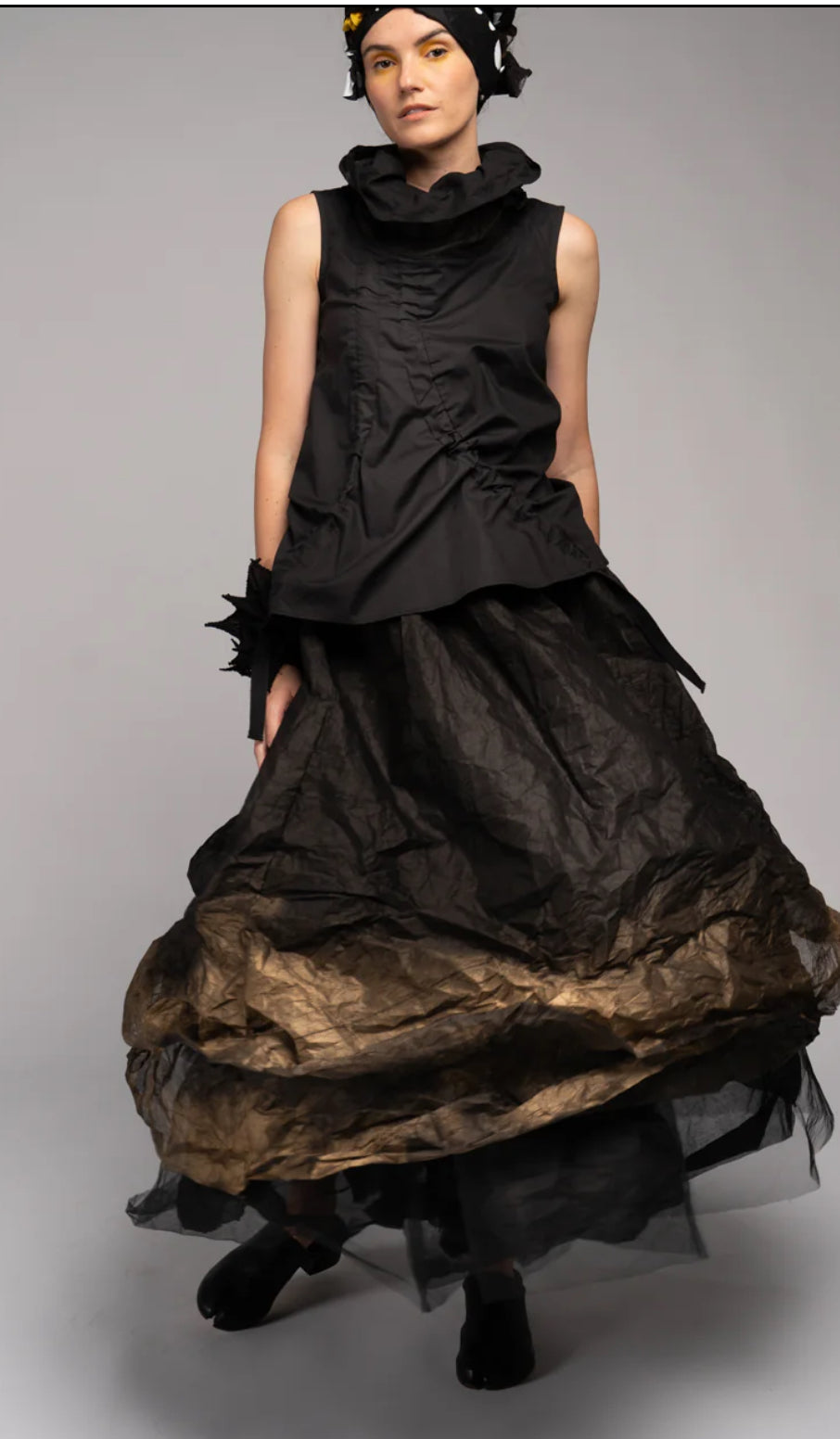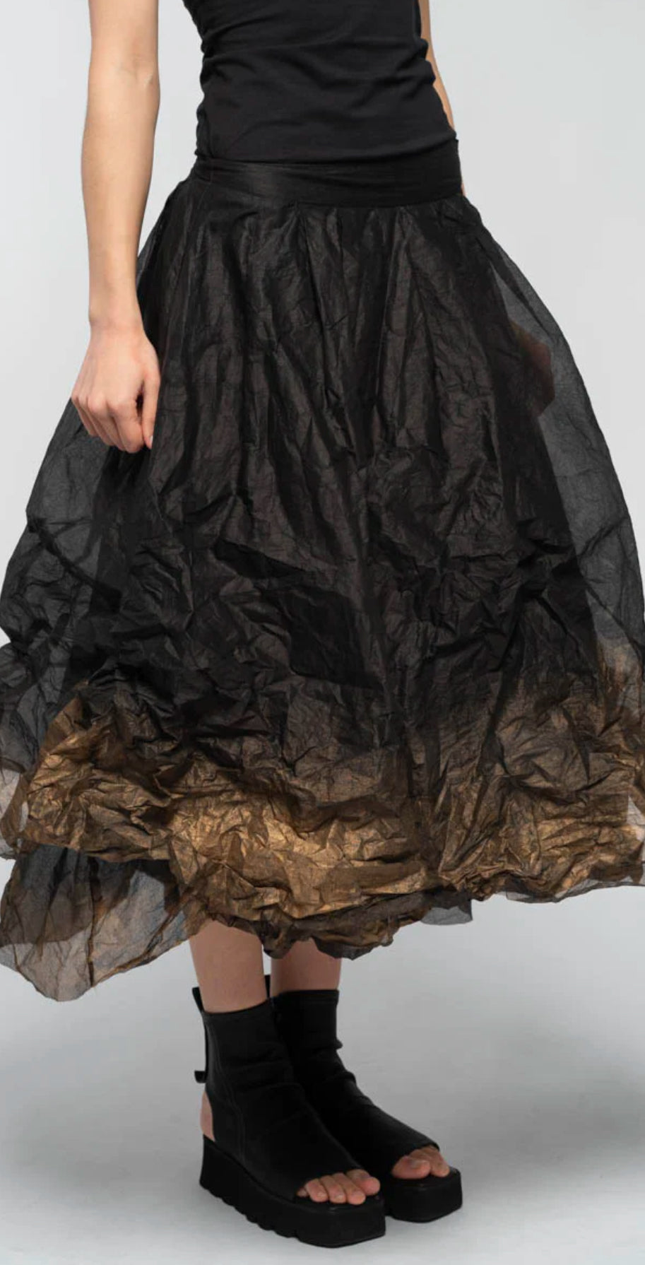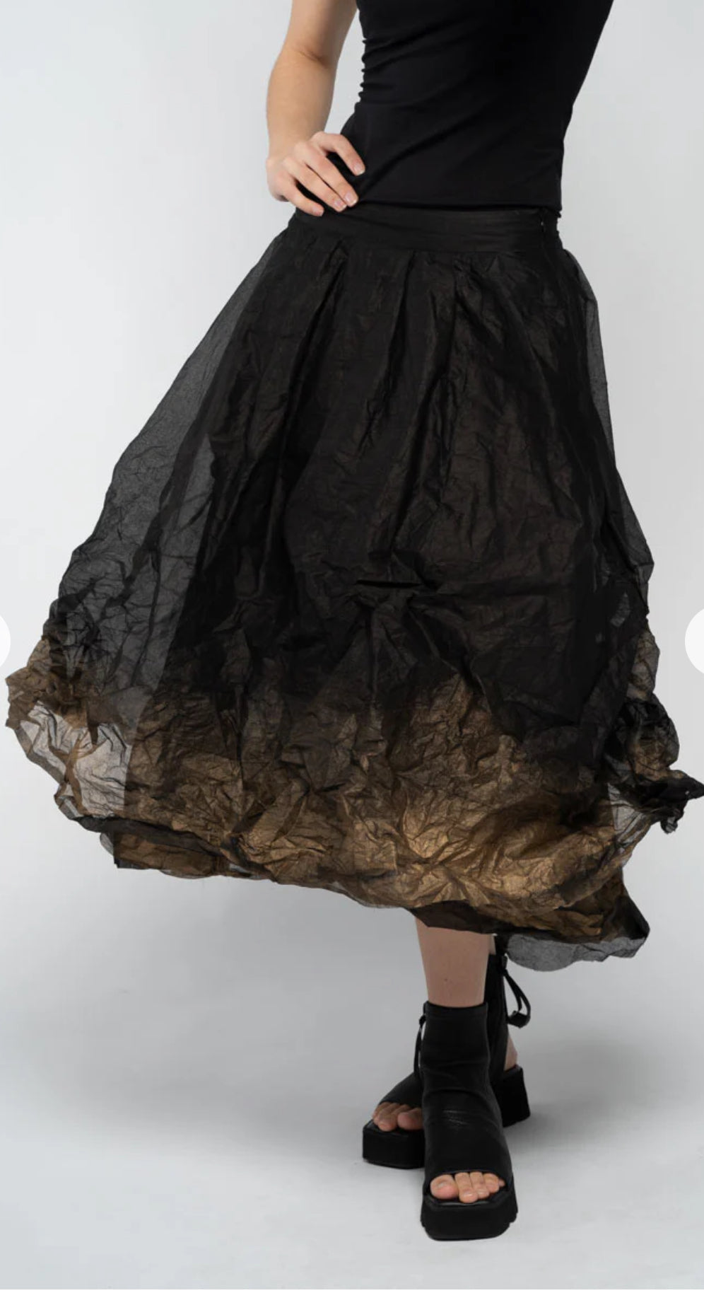 Make a bold statement with the Monarch Skirt, a stunning piece that exudes artistry and sophistication. Featuring a fitted waist that flows into cascading layers of hand-painted organdy and voile, this skirt offers texture, volume, and undeniable flair. The raw hem adds a contemporary edge, while the elastic back waistband and side zip closure ensure a comfortable fit.