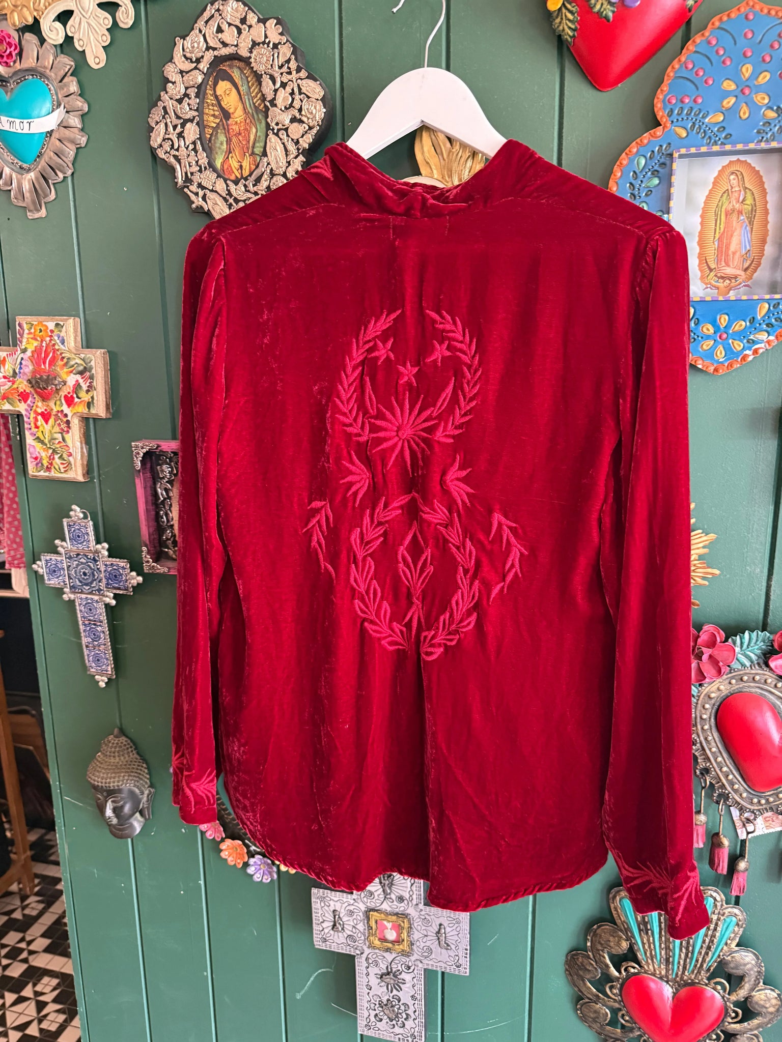 Sumptuous silk velvet in this jacket with vine-like embroidery along the front and sleeves, stunning emblem on the back. Longer back tail which is very flattering on.