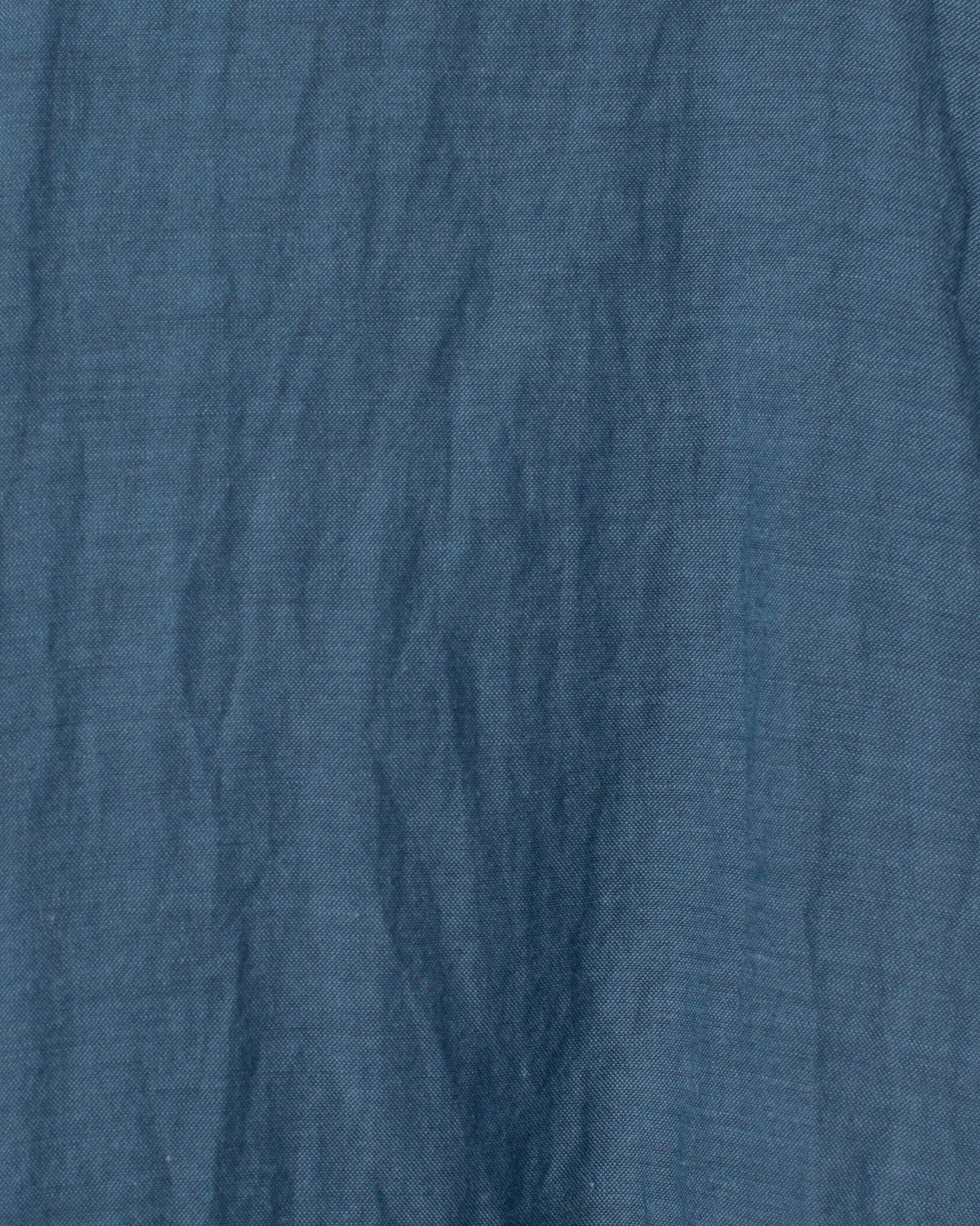 V neck, long-sleeved blouse in sushi voile with fagoting seam at hem and around neckline, decorated with wrinkled frills and buttoned front.