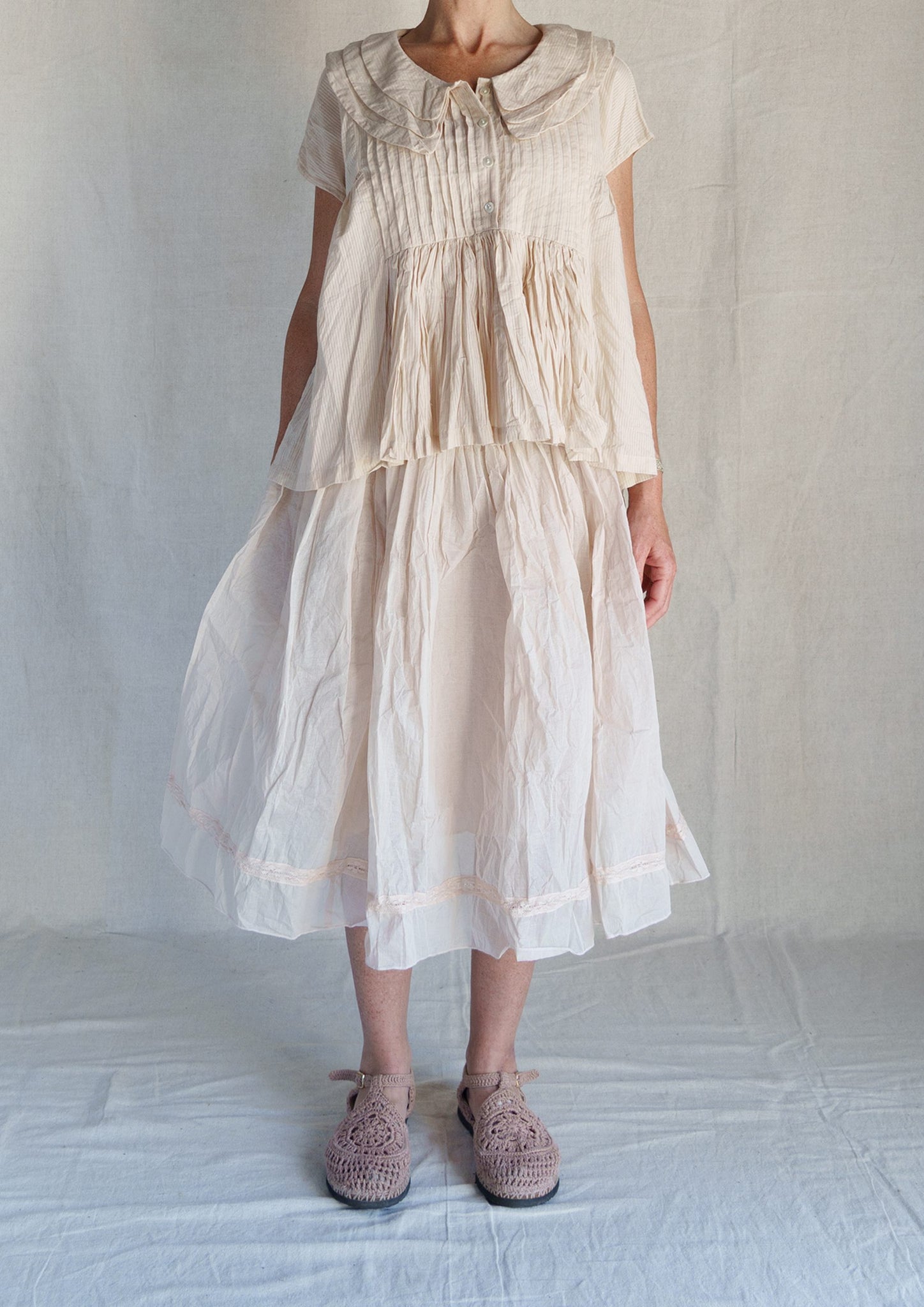 Details: Peter Pan collar with three tiered ruffles, pleats at the bust