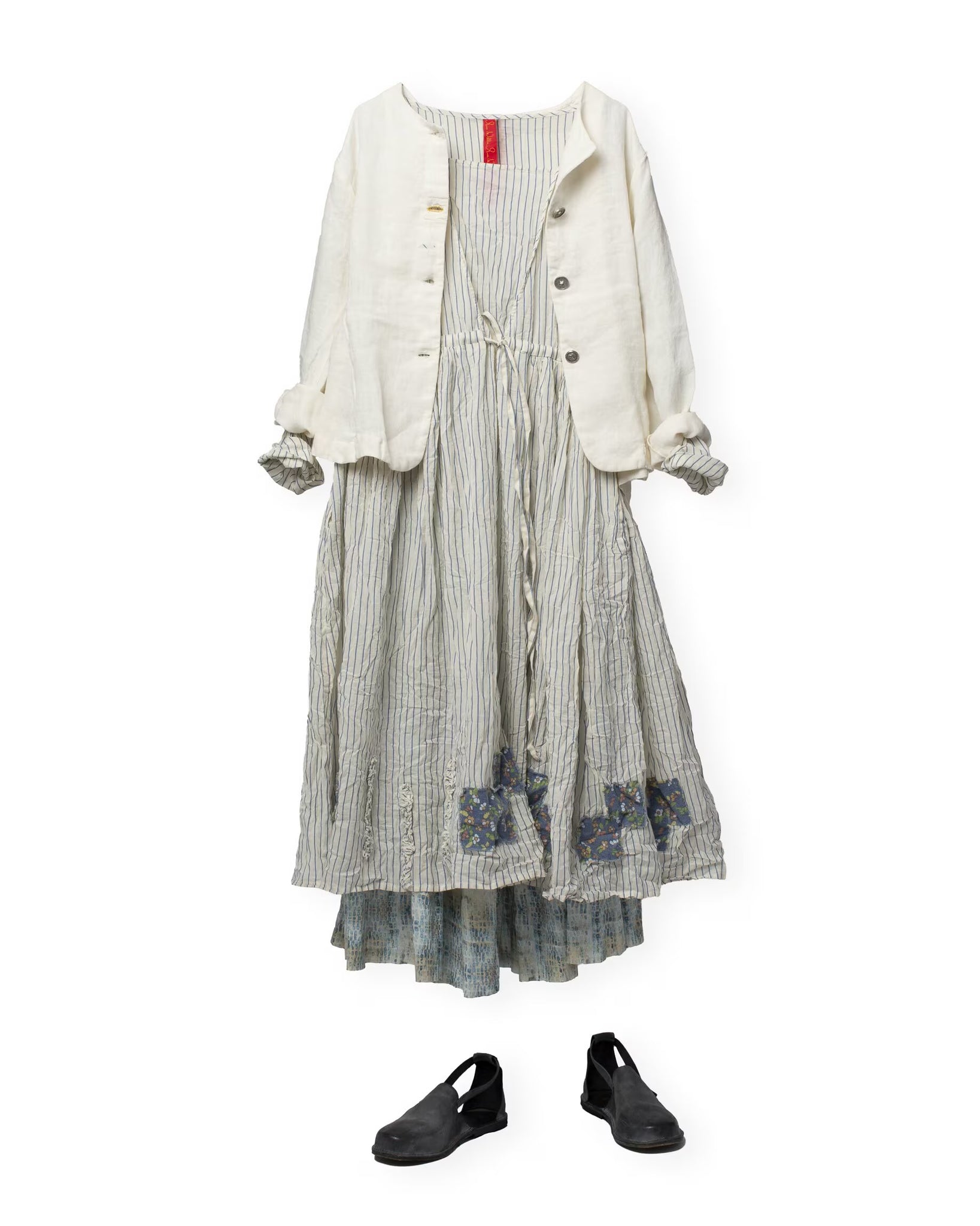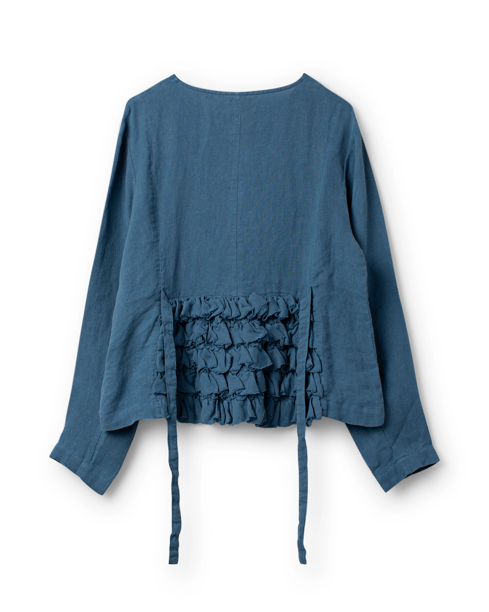 Jacket in linen in a slightly fitted model with wedges from the waist front, wrinkled flounces and tie ribbons at the back for a lovely silhouette. Buttoned front with different buttons and one buttonhole placed on a patch and sewn in red for a playful effect.