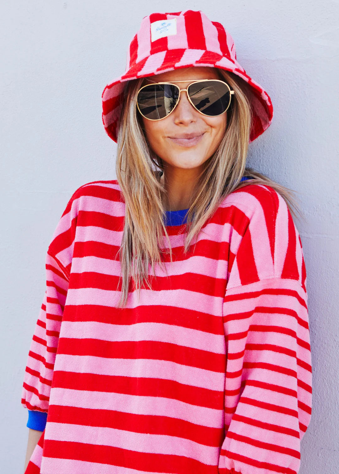 This bold striped bucket hat is pure summer happiness. Made from soft terry towelling in vibrant green and light green stripes, it adds a playful pop to any outfit. The wide, relaxed brim gives it that effortless beach-day vibe, while the Hammill & Co patch brings a cool retro finish.