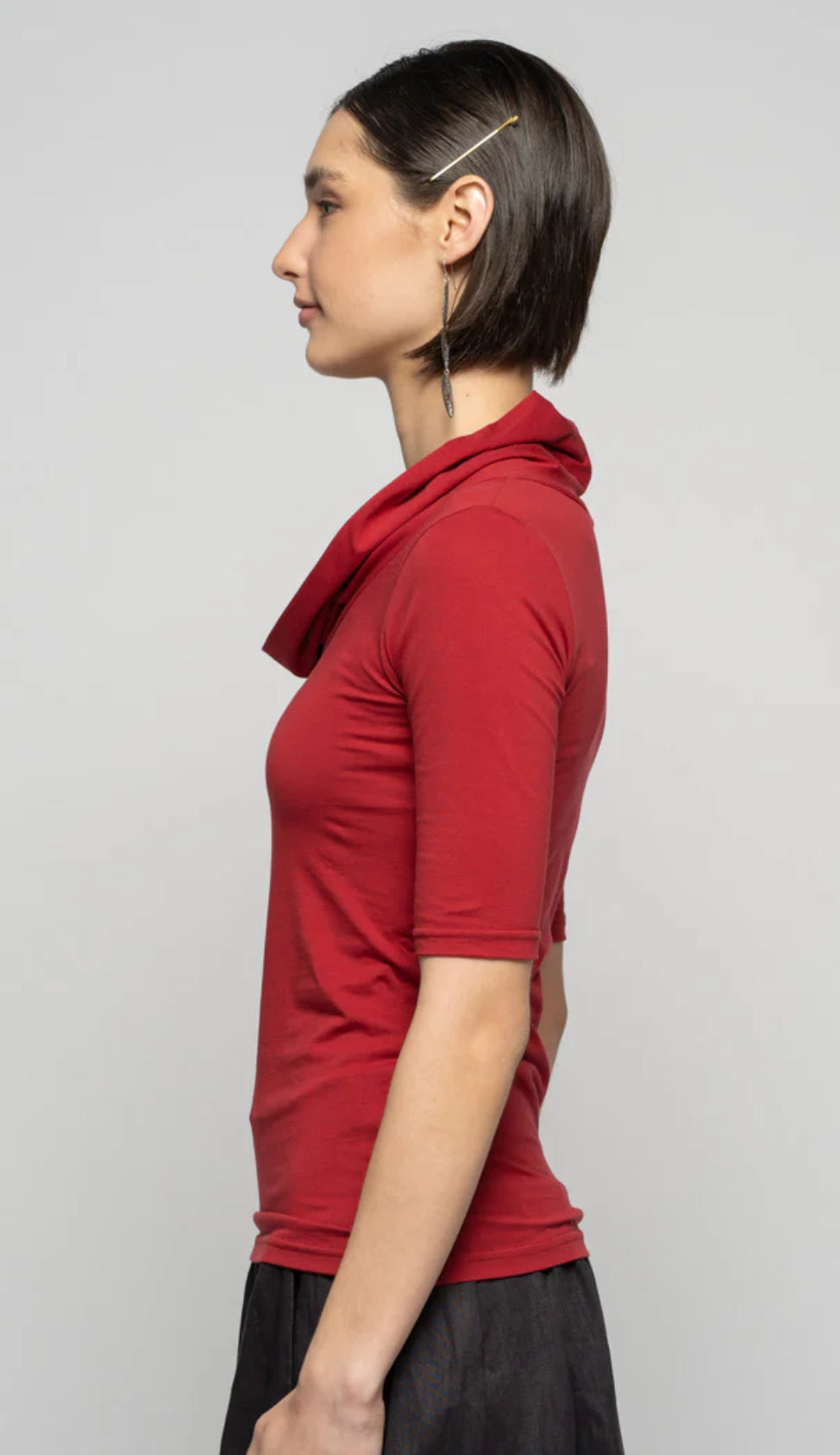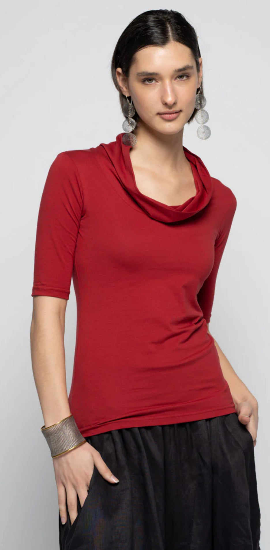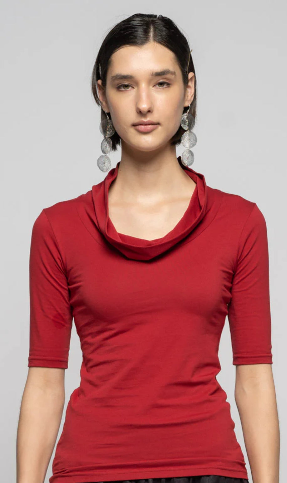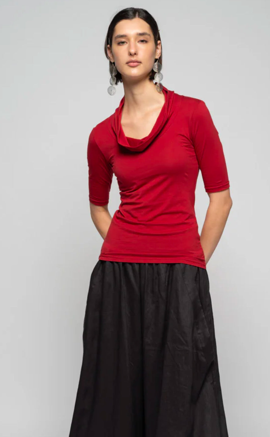 A marriage of fibres in a year-round style, the Miyako Collar Top feels just as beautiful as it looks. The semi-fitted silhouette flows nicely around the body. The cotton-spandex fabric is soft on the skin and breathes well, its fine weight giving a smooth line that's perfect for layering. The collar can twist, sculpt or fold for different looks.