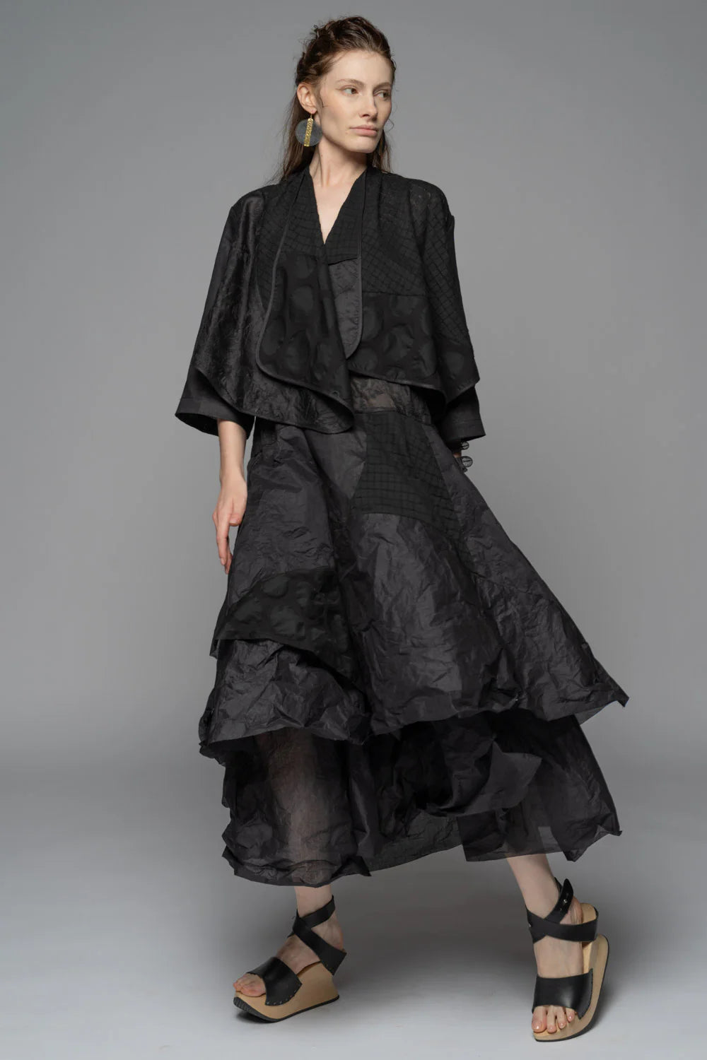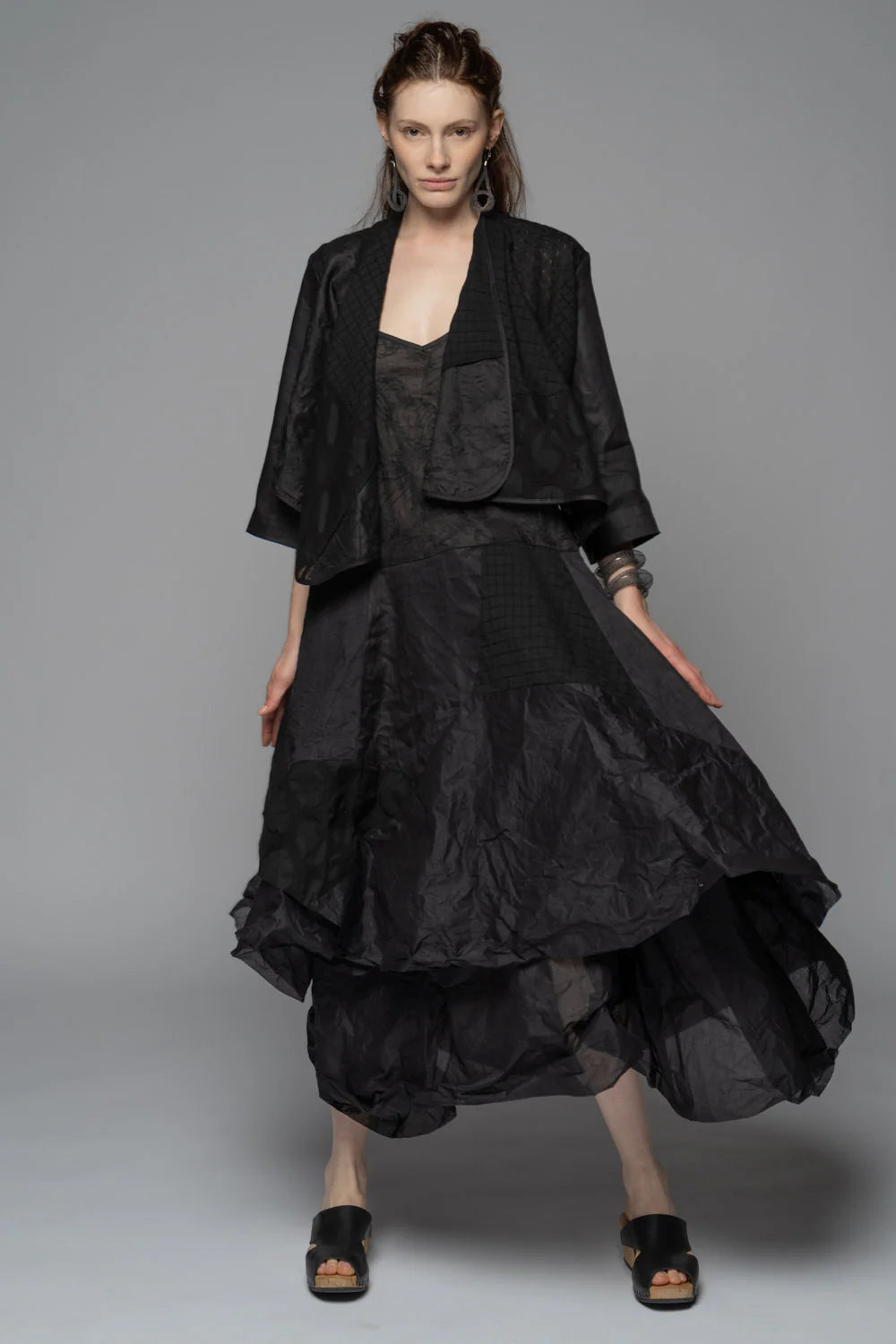 A soft little layer with quiet drama, the Celia Patch Wrap slips over outfits like a whisper of cloud. Cut in a cotton–linen blend and pieced from different airy fabrics, it has a gently sculpted drape that falls around the body. Wear it open for easy movement and light coverage, or fasten the button to create a more wrapped, cocooned silhouette. Lightweight yet textural, it’s the piece you reach for when you want just a touch of coverage in summer.