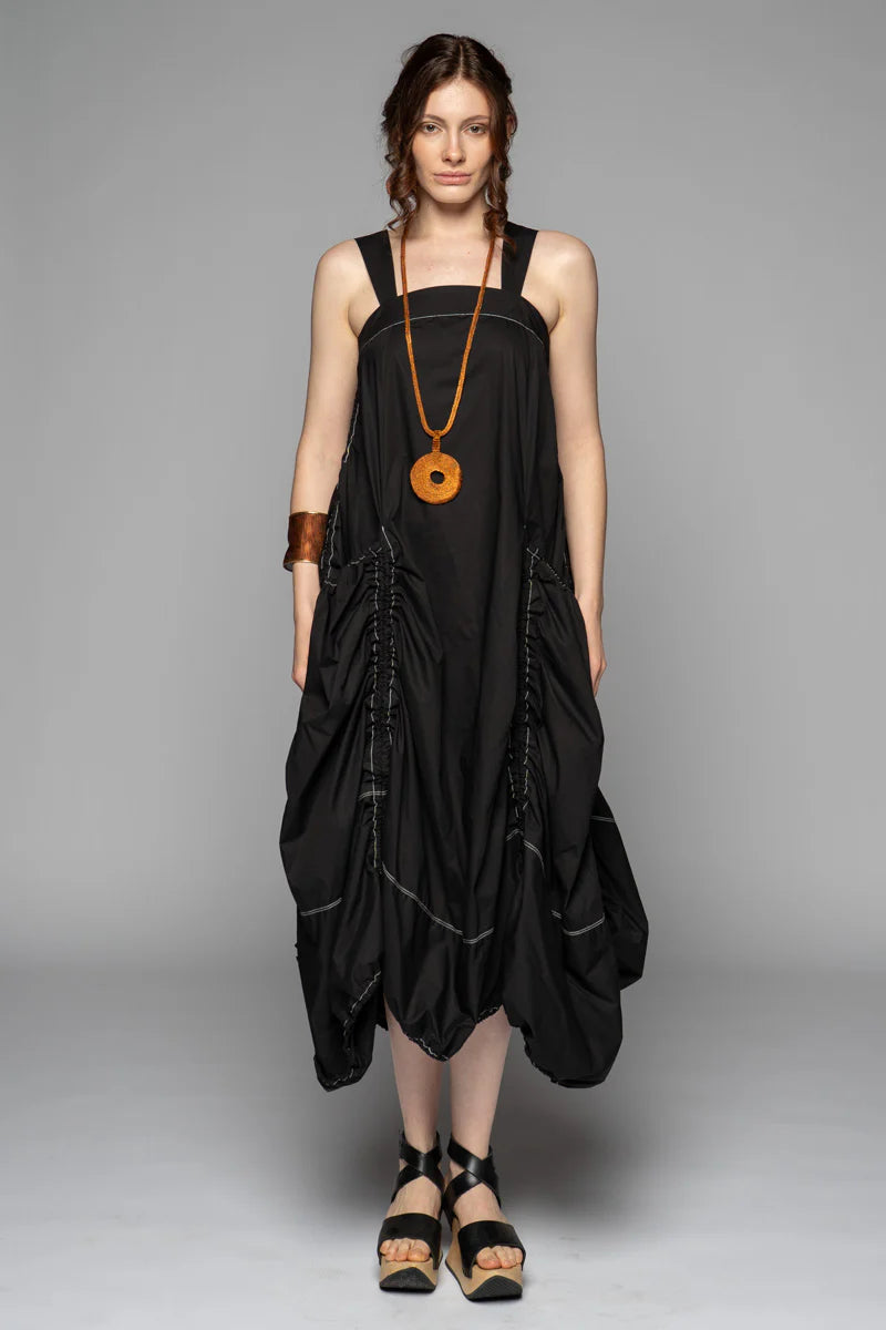 A study in ease. Faerwin is cut from crisp cotton poplin that lifts lightly from the body, moving with the smallest breeze. Ruched channels trace the skirt; a gentle pull of the ties gathers volume or releases it, shifting the hem from clouded bubble to quiet drift. Broad straps frame a softened square neckline, while a concealed zip and discreet button tabs at the back allow small, satisfying adjustments. A single generous pocket, outlined in subtle contrast stitch, lends a crafted calm. Considered, airy, and softly architectural—everyday luxury with a hush.