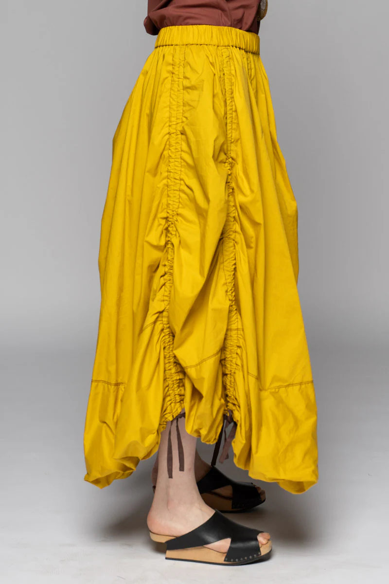 Crisp cotton poplin is shaped into soft architecture: the Faerwin Skirt drapes light as air, then sculpts with adjustable ruching ties to create buoyant volume and a beautifully irregular hem. A wide, full elastic waistband sits comfortably through the day, while deep pockets and contrast stitching lend utility and subtle detail. Pair with the Gisella Top or Gisella Tunic for an effortless set.