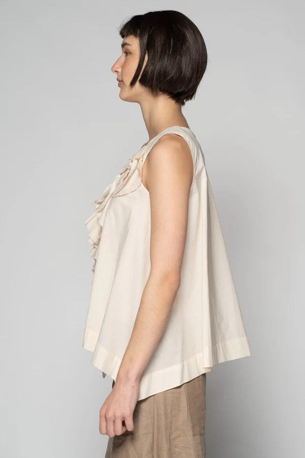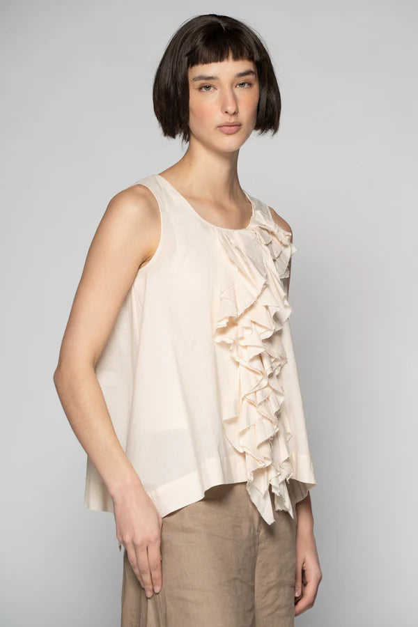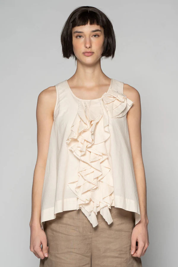 Light as air and rich in texture, the Kiki Frill Top carries a gentle drama — a nod to Elizabethan finery softened through a contemporary dogstar lens. Crafted from 100% cotton voile, its cascading frills fall effortlessly, offering movement and mood without weight.