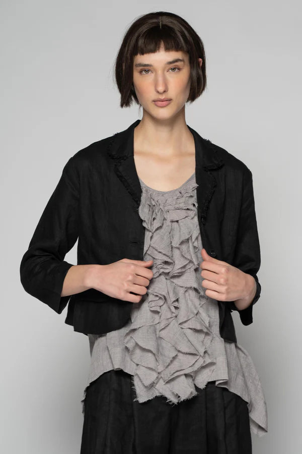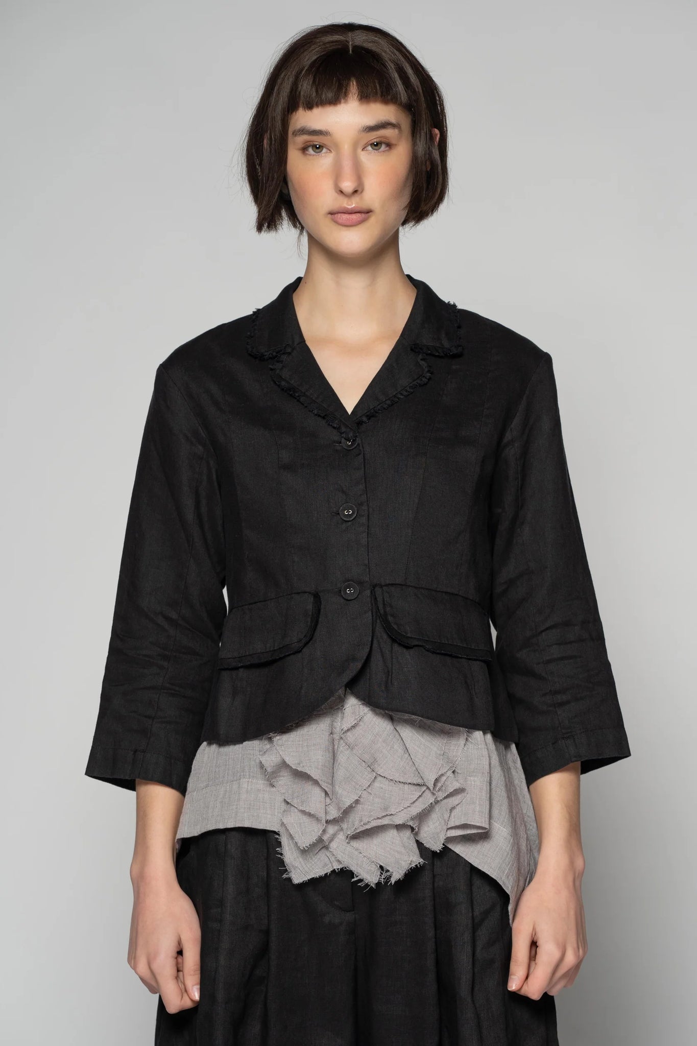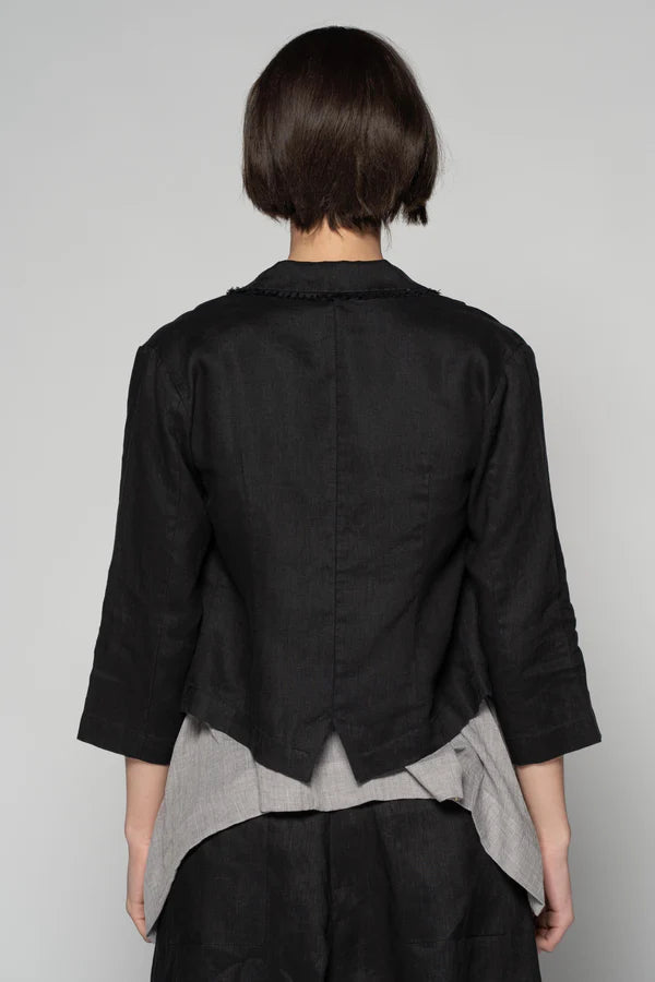 Cut with gentle structure, it features a notched collar, curved hem, and three-button front for a composed but relaxed line. Flap pockets add practical charm, while the cropped, bracelet-length sleeve keeps it fresh for warm days and layered nights. Designed to move through the seasons with ease.