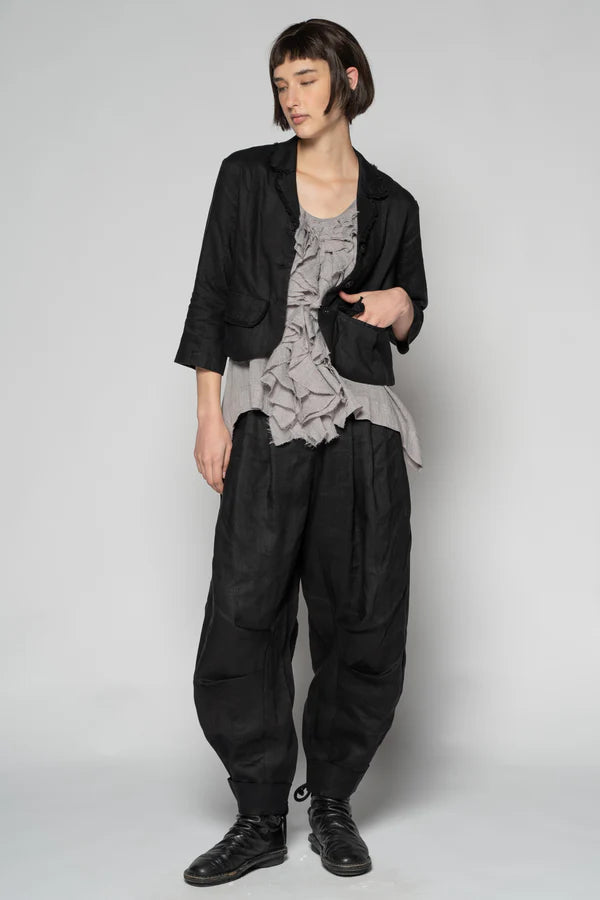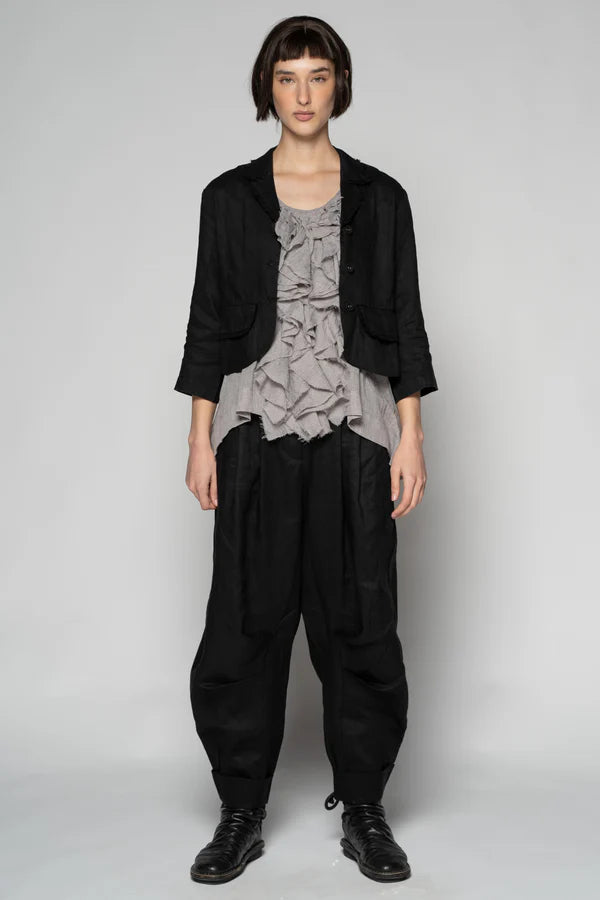 There’s a hush to well-loved linen — softened by time, steady in its purpose. The Ouna Jacket distils that feeling into a plain, washed linen layer: quietly tailored, easy to wear, and made to sit lightly over your favourite silhouettes.
