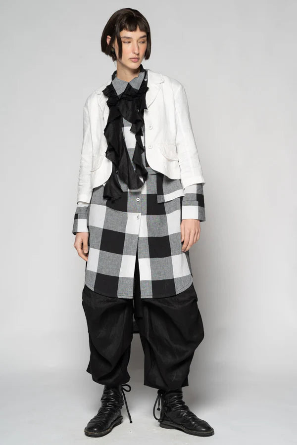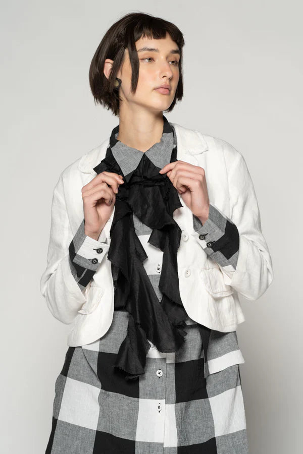 There’s a hush to well-loved linen — softened by time, steady in its purpose. The Ouna Jacket distils that feeling into a plain, washed linen layer: quietly tailored, easy to wear, and made to sit lightly over your favourite silhouettes.