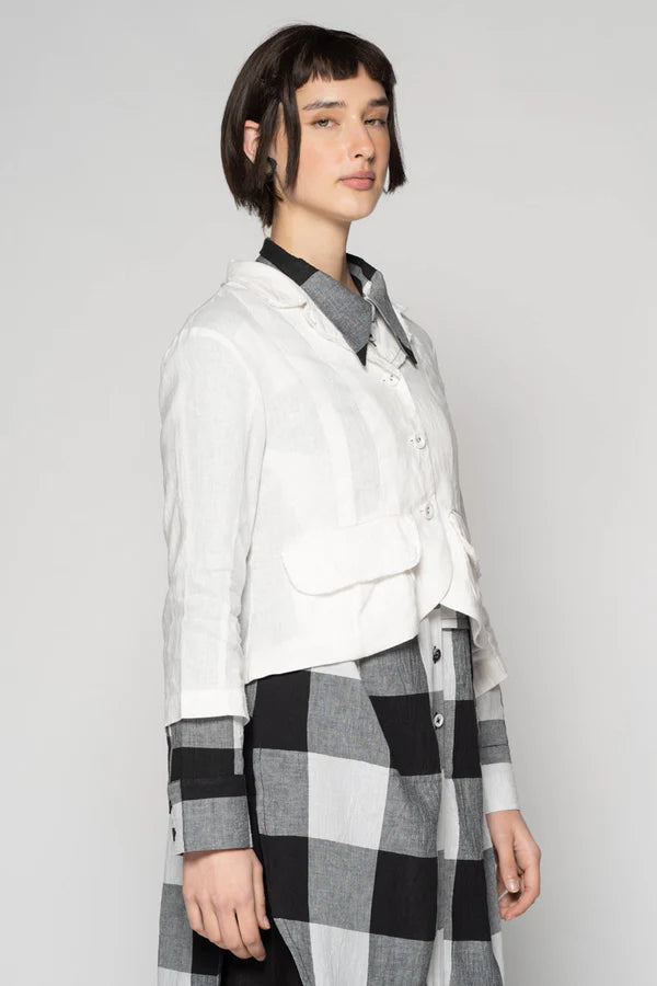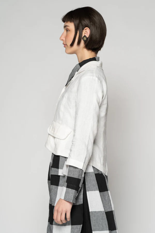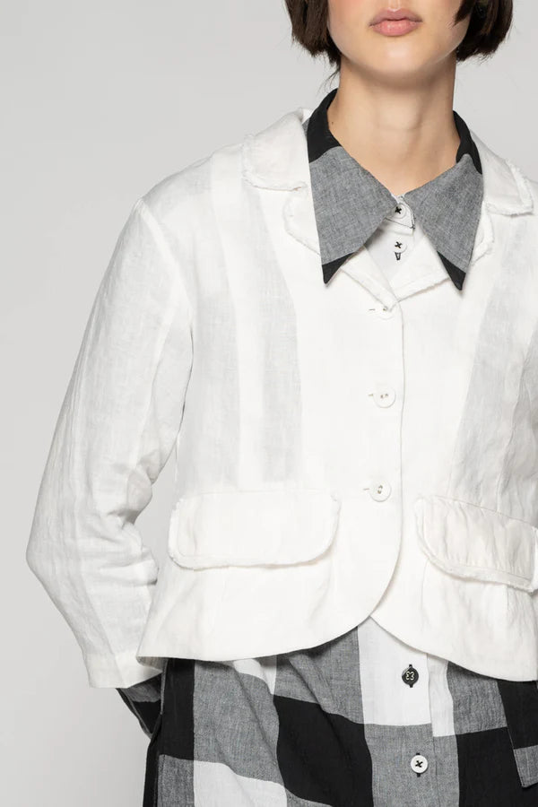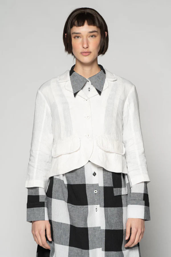 Cut with gentle structure, it features a notched collar, curved hem, and three-button front for a composed but relaxed line. Flap pockets add practical charm, while the cropped, bracelet-length sleeve keeps it fresh for warm days and layered nights. Designed to move through the seasons with ease.