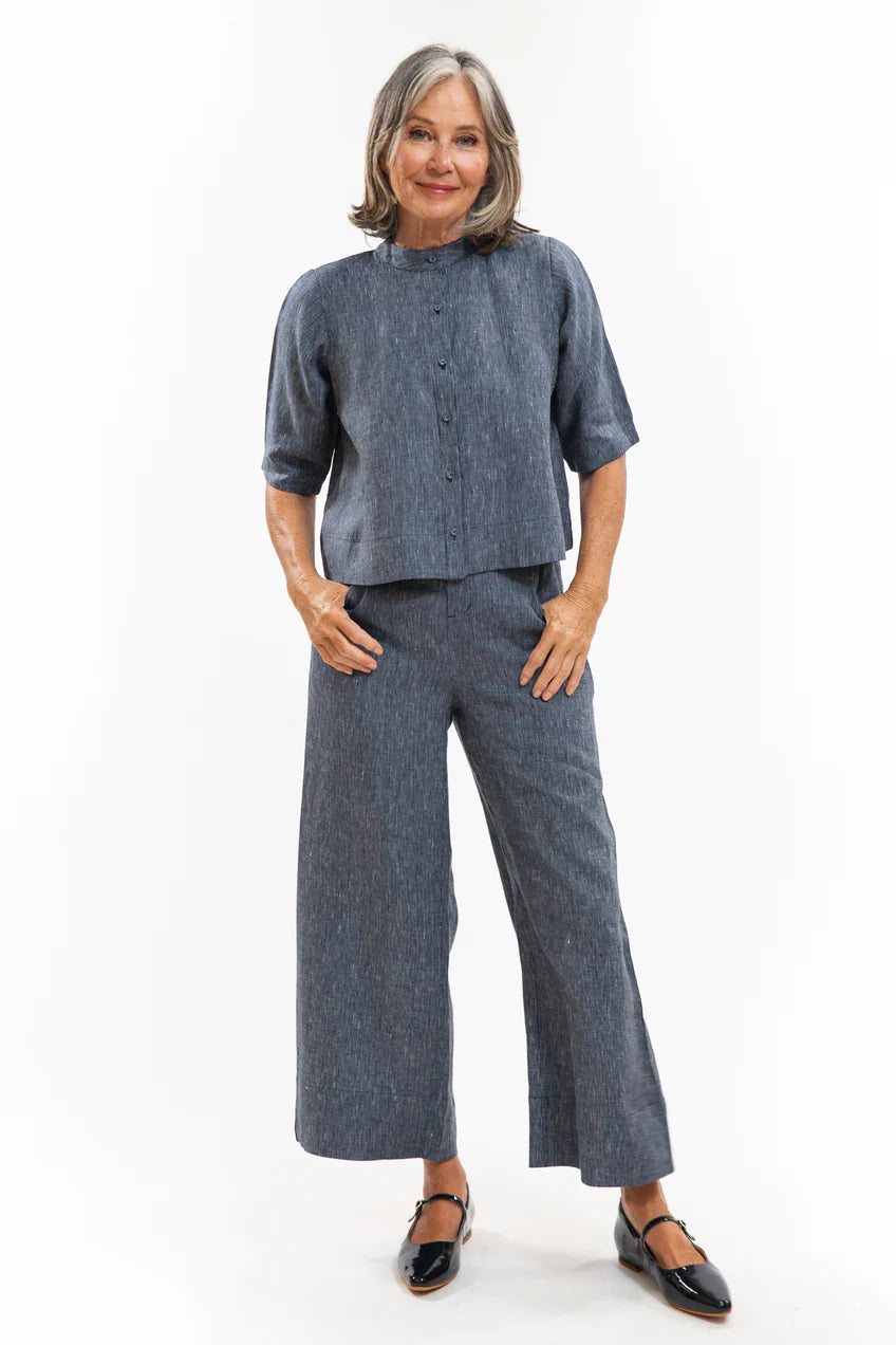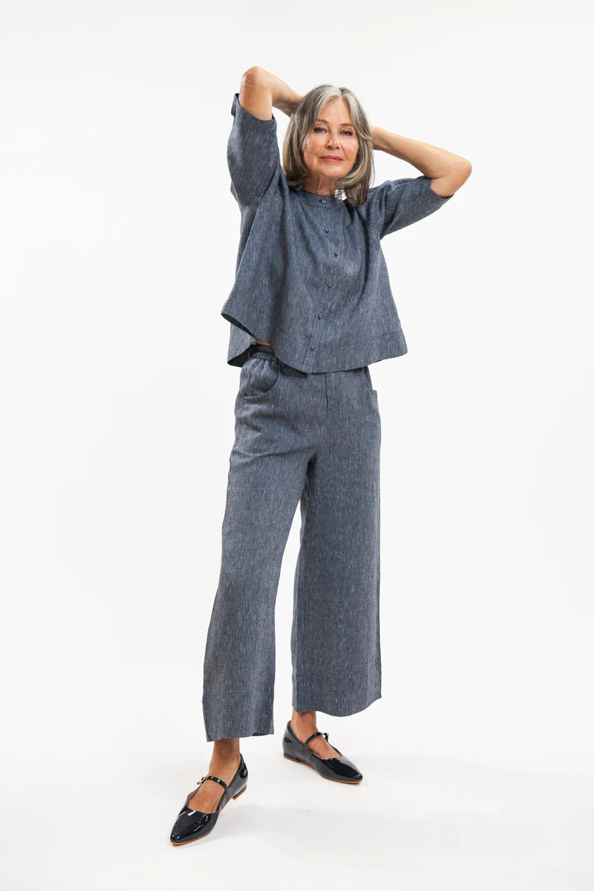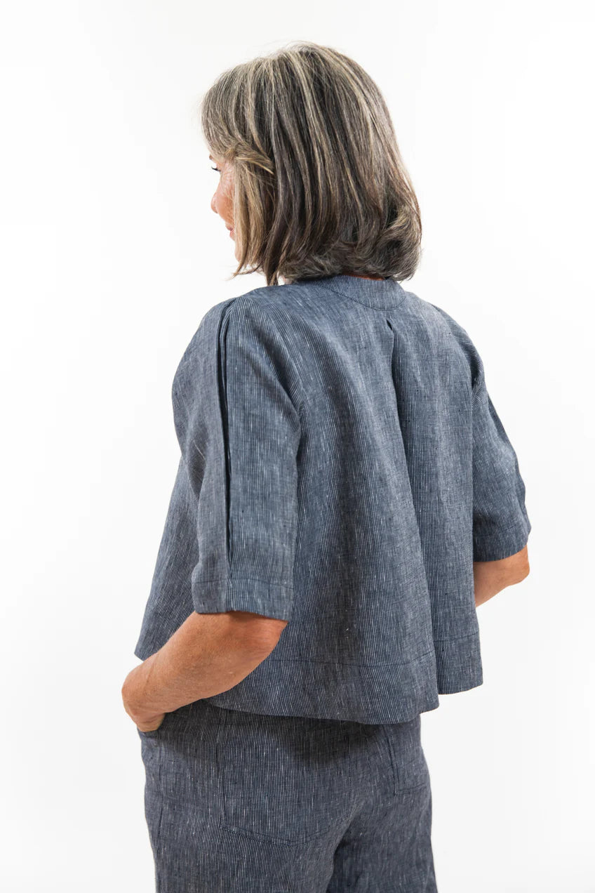 The Essentials Collection Loretta Top is a wonderful multipurpose top in a vintage floaty silhouette. This top is reversible, and features include a small collar stand with a button stand through the centre on one side and, on the other, a dramatic pleat, adding swing to the top. When worn with the buttons to the front, it also works perfectly as a lightweight jacket layer. The sleeves finish around the elbow and have pleating details through the shoulder and sleeve hem to add a slight 'puff', enhancing the vintage feel.
