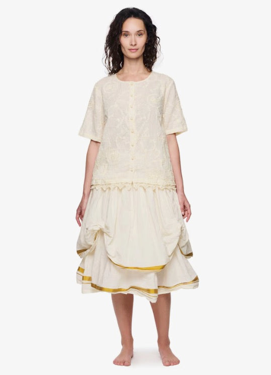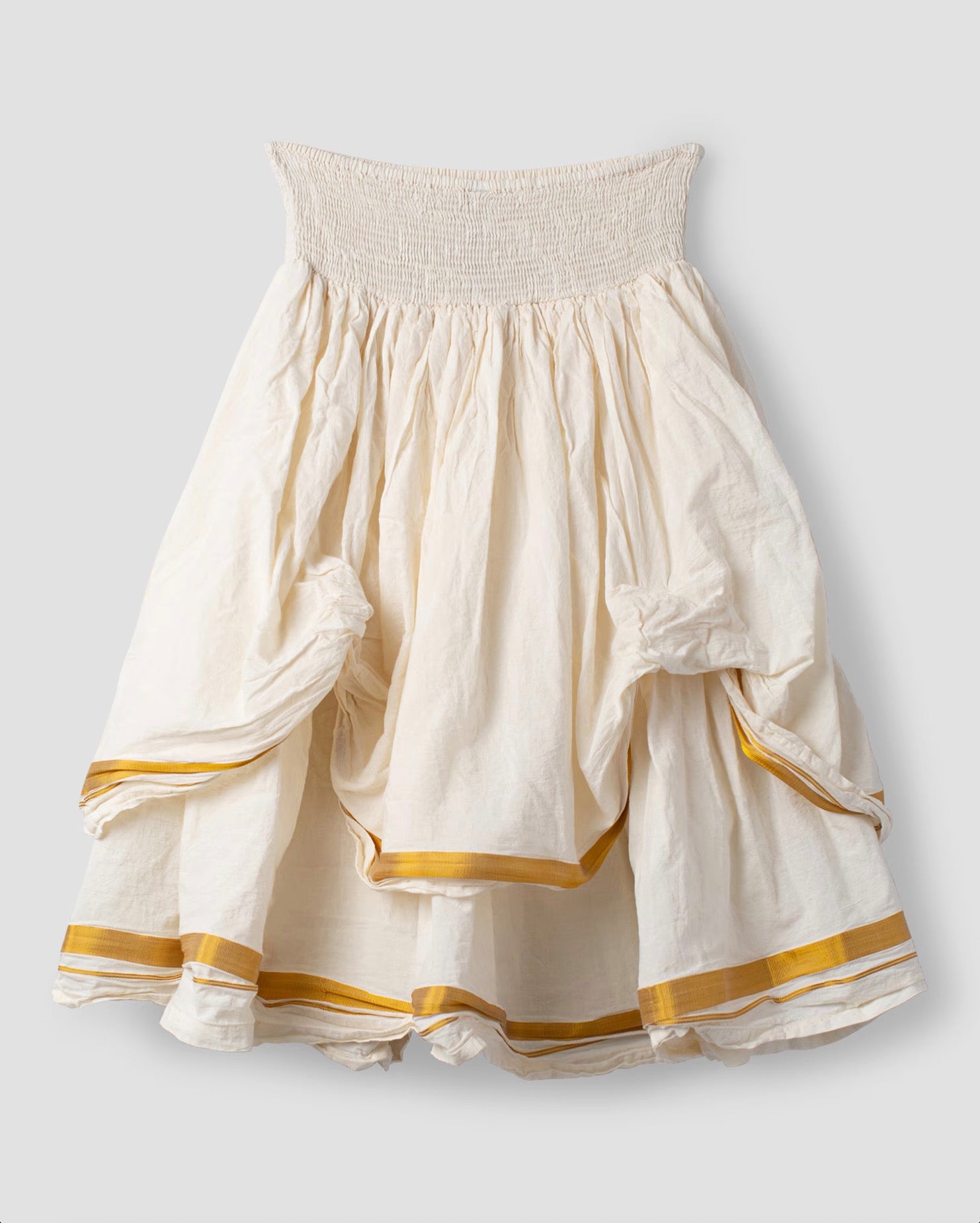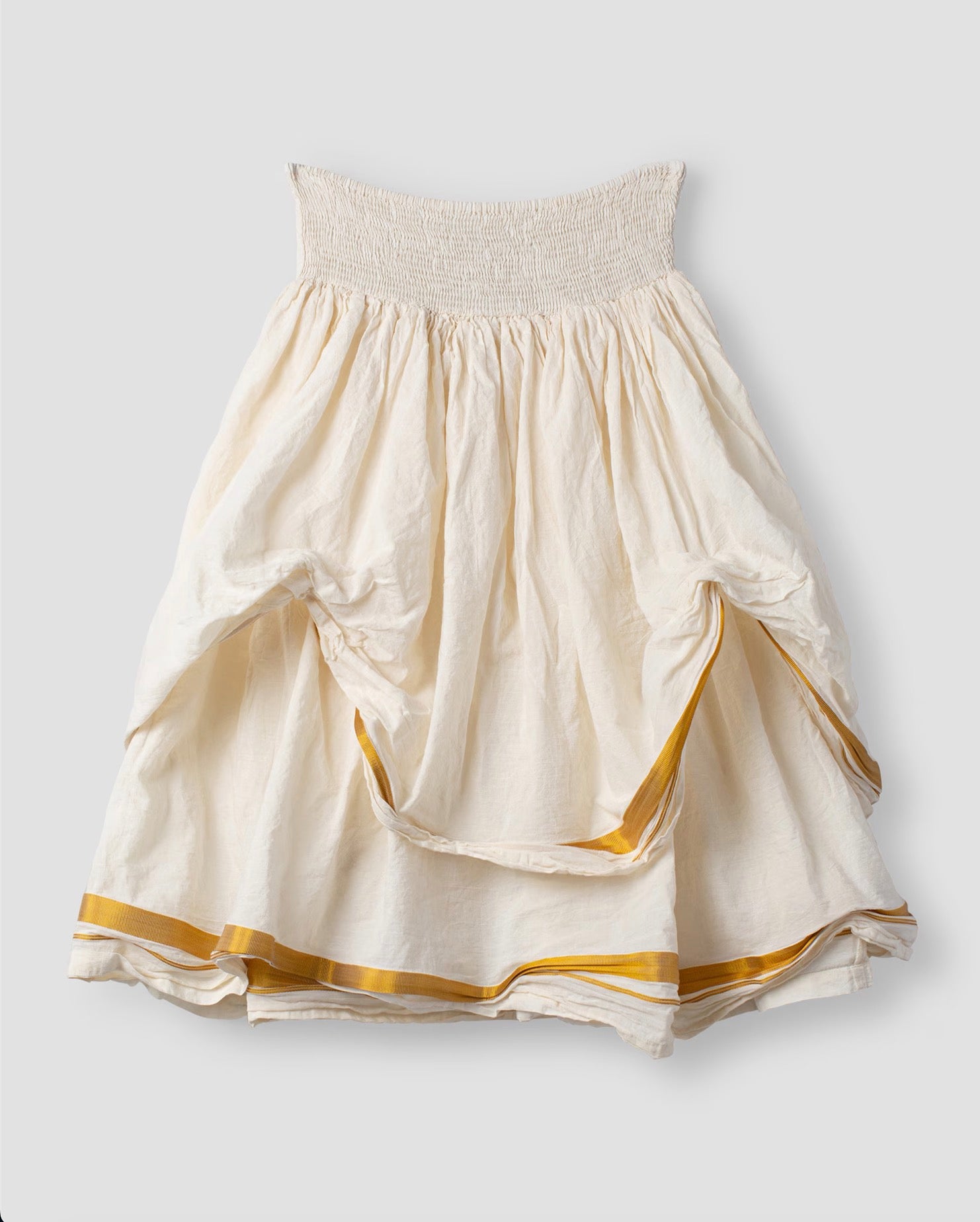 Calf-length cotton skirt with gold stripe in double layers. Smock at the waist for a good fit and wrinkled from the smock for lovely volume.