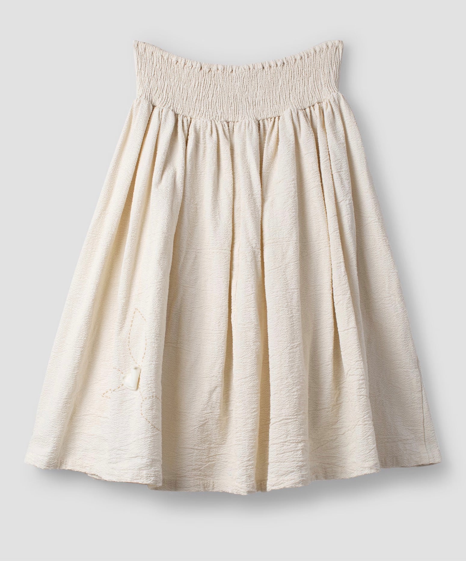 Short flower cotton skirt with lovely volume, smock at the waist for a good fit.