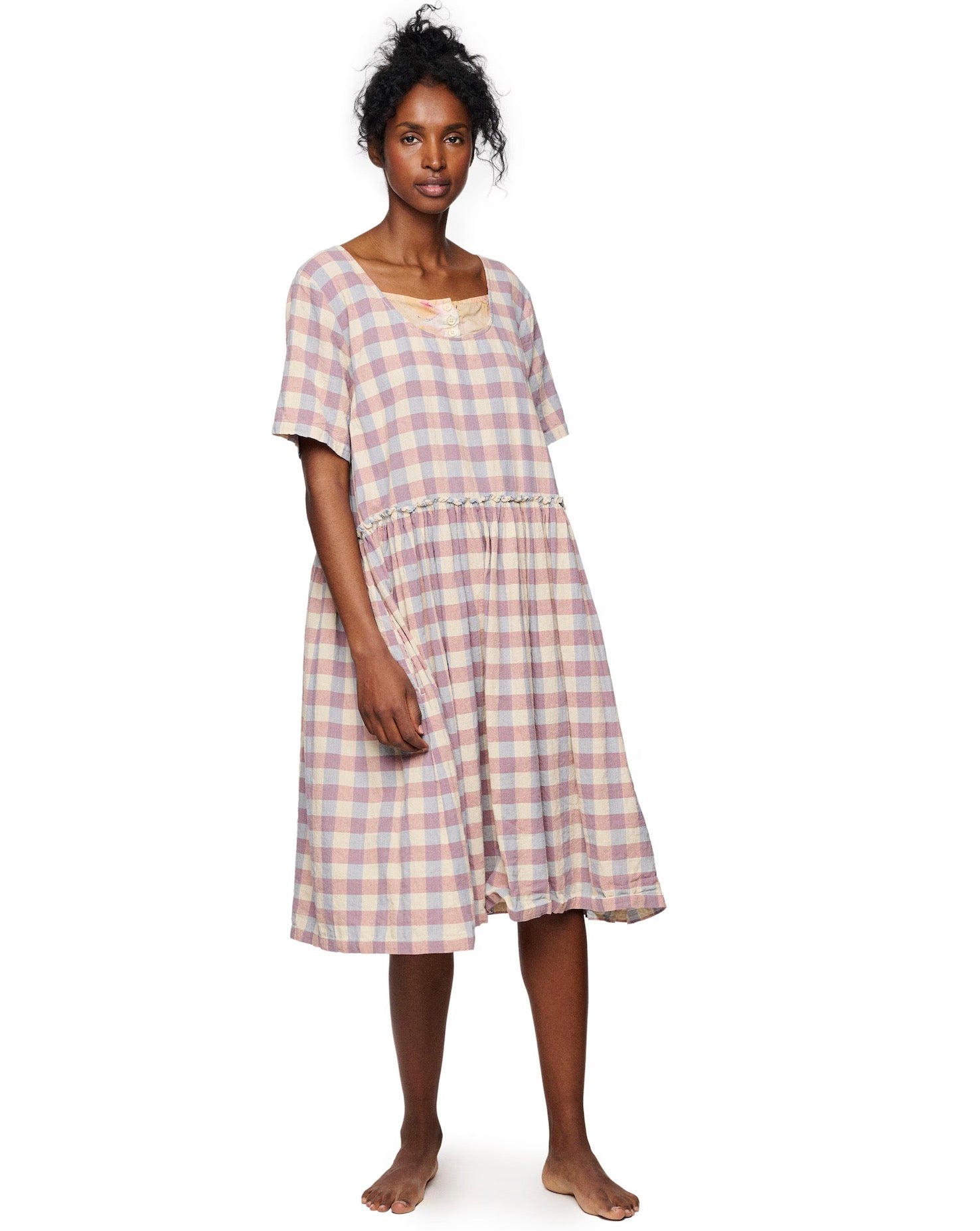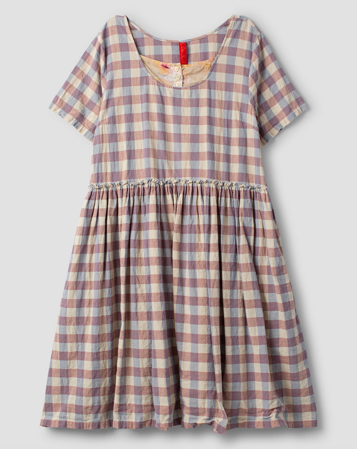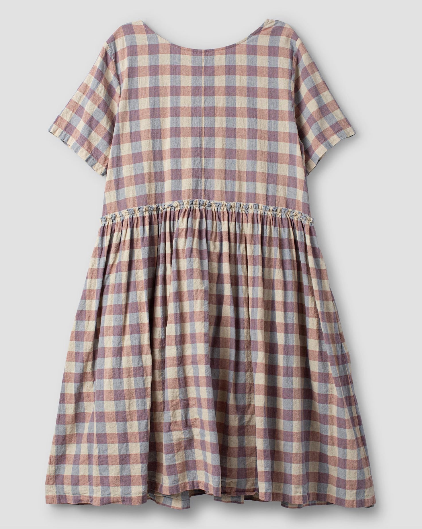 Knee-length, checked cotton dress with short sleeves. Decorative flower voile and buttoning at the neckline, wrinkled from the hip for lovely volume and side seam pockets.