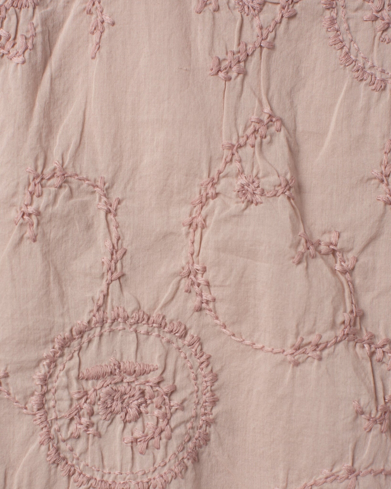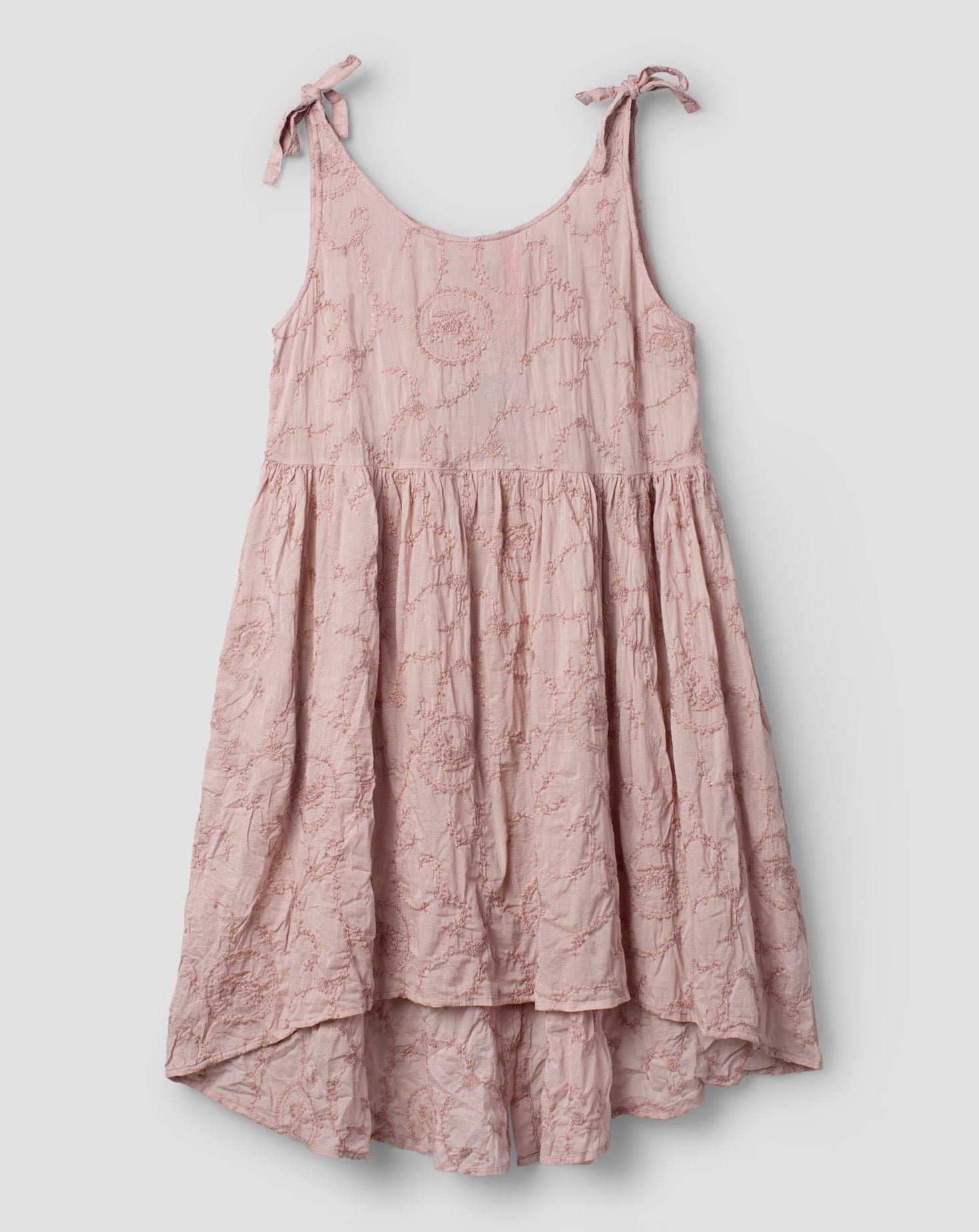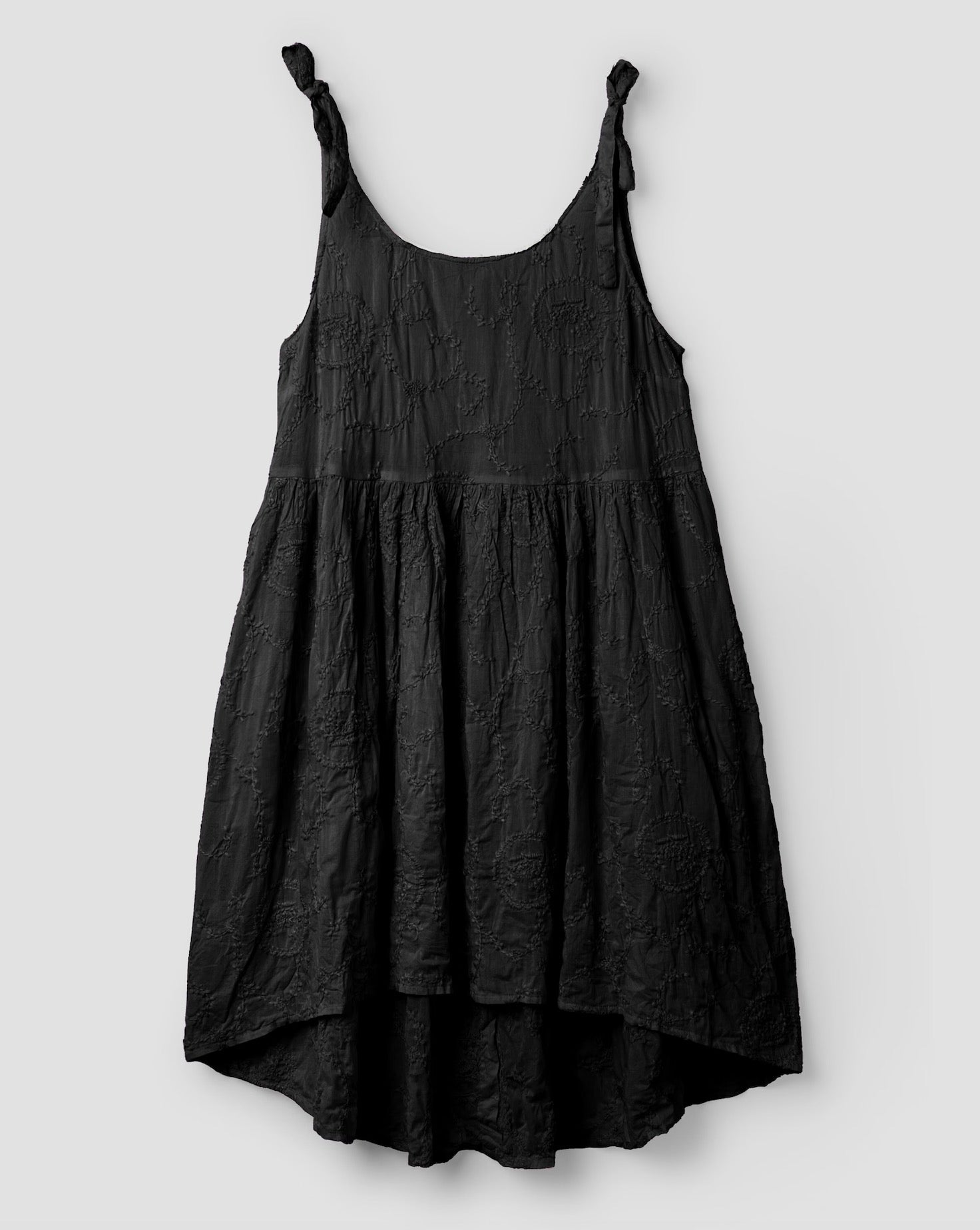 Sleeveless tunic in embroidered voile with tie ribbons at the shoulders. Buttoning at the back with crocheted buttons, wrinkled from the waist for lovely volume and side seam pockets.