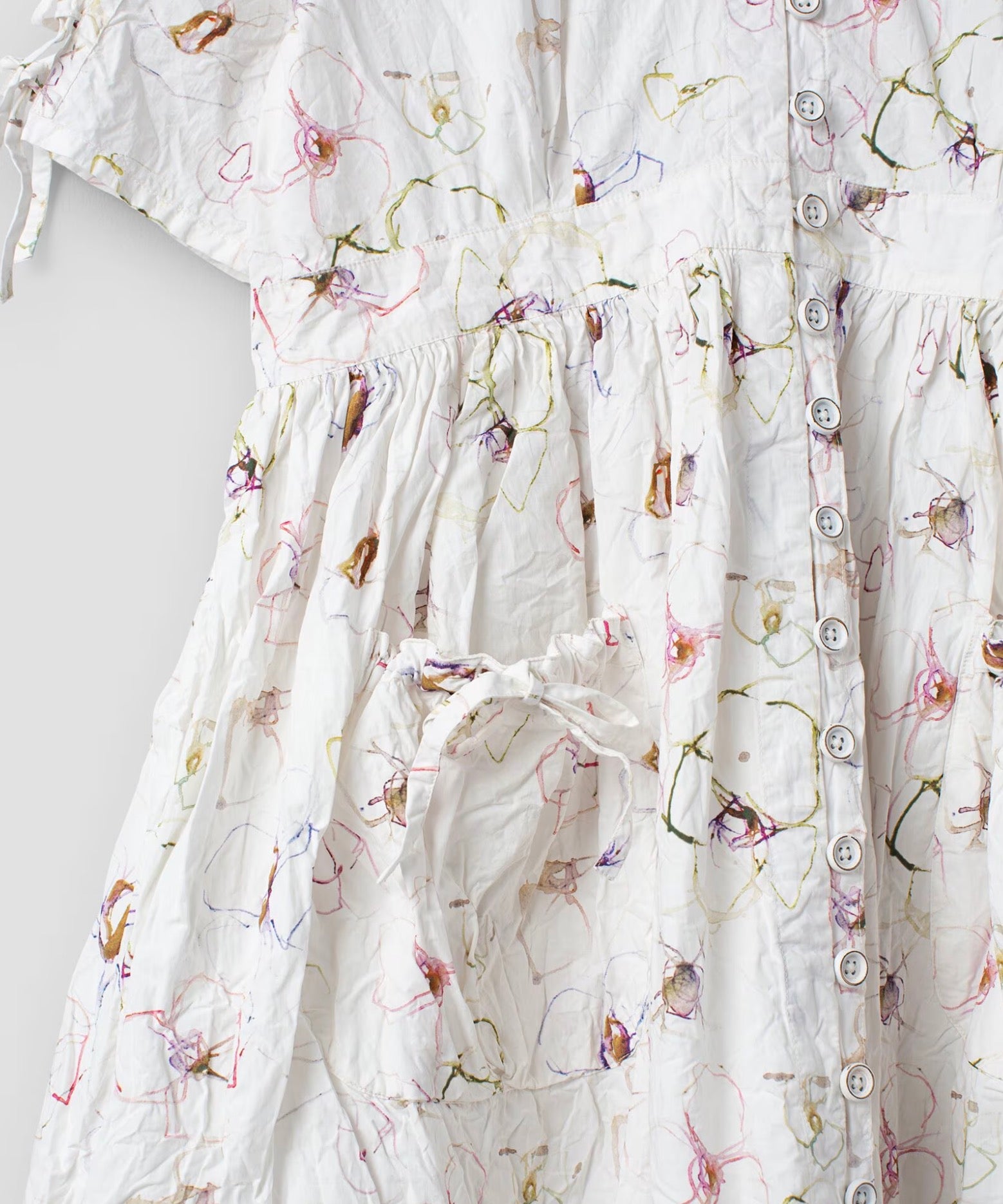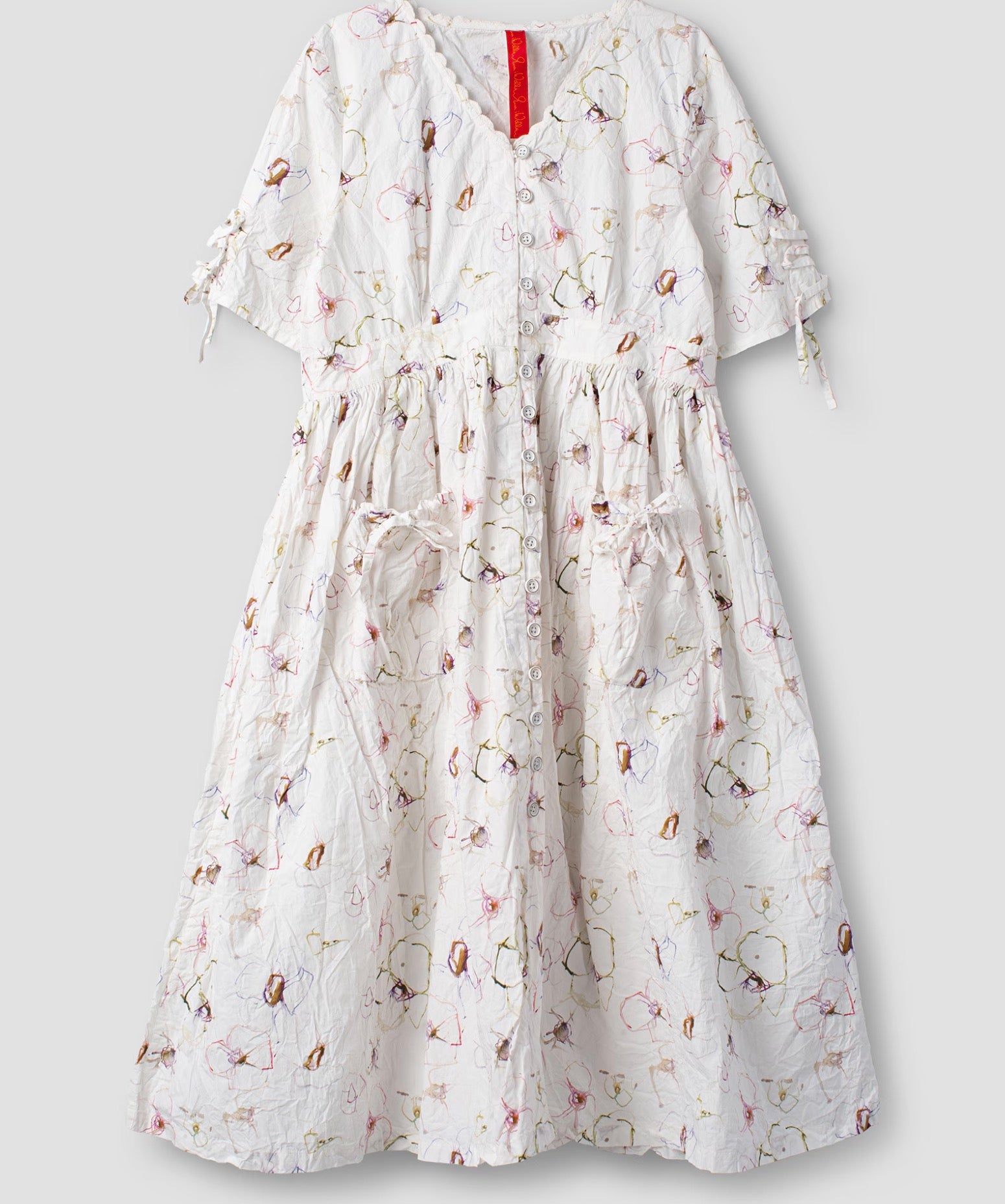 Calf-length, flower cotton dress, short sleeves with decorative lacing. Crocheted lace at the neckline, buttoning front and back, wrinkled from the waist for lovely volume and external pockets with drawstring.