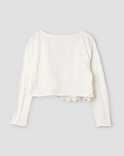 Long-sleeved wrap around tee Sabina in striped jersey with tie ribbon and lace.Jersey cotton with light pink stripes.Bust freeLength at back 44cm