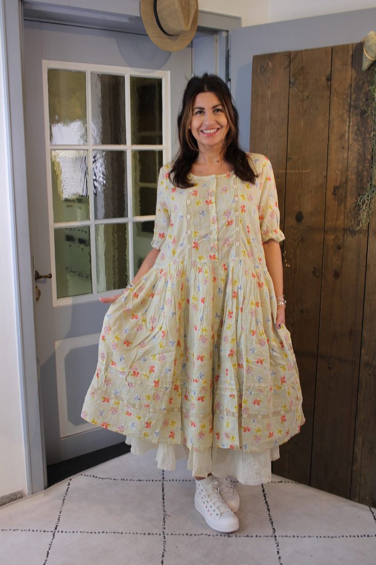 Knee-length dress in our fine flower cotton with elastic ends on the sleeves. Buttoning at the back and wrinkled ruffle at the neckline at the front. Details with lace and faggoting stitching at the front waist. Wrinkled from the waist and side seam pockets.