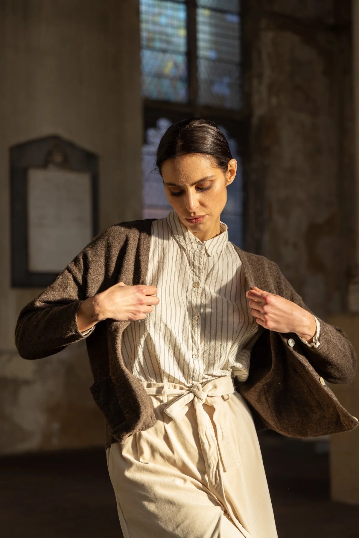 Our Freya Cardigan is made from a beautifully fine 100% wool thread. It comes in two sizes and has been designed to be worn oversized. It has two pockets at the front and works with just about every piece we make, keeping you warm throughout the day and night.