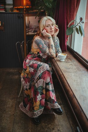 The print on our FLT dress has a more antiqued palette than the kimonos, with faded rose in place of the red. Adjustable straps, an oversized cut, and soft, flowy bamboo viscose make it a wardrobe staple for layering, running errands, dancing, lounging or napping… it’s a must-have for travel, wherever you roam. And speaking of versatile — this piece can be worn with the eye on the front of the bodice (so cool) or the florals on the front (so pretty), depending on your mood! The result is one of our favourite pieces in the collection: beautiful and completely unique, with a lot of romance, and a touch of rock and roll.