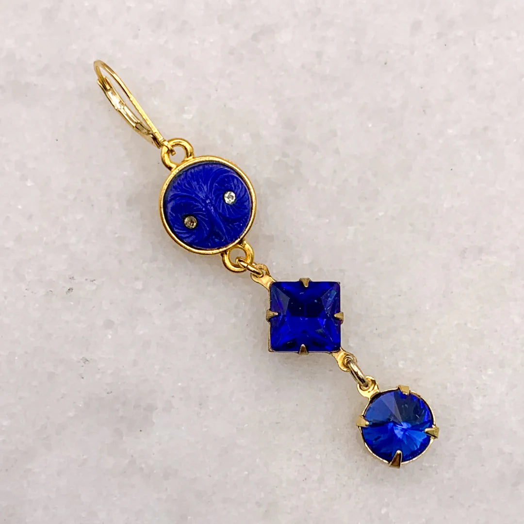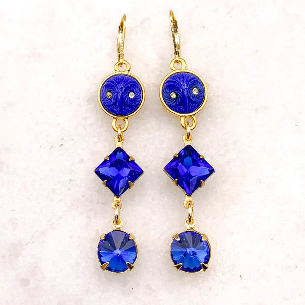 Adorable Earrings Featuring an Amazing Blue Owl, Vintage Cut Crystal from 1940’s. Partnered with Fabulous Quality Vintage Sapphire Cut Crystals