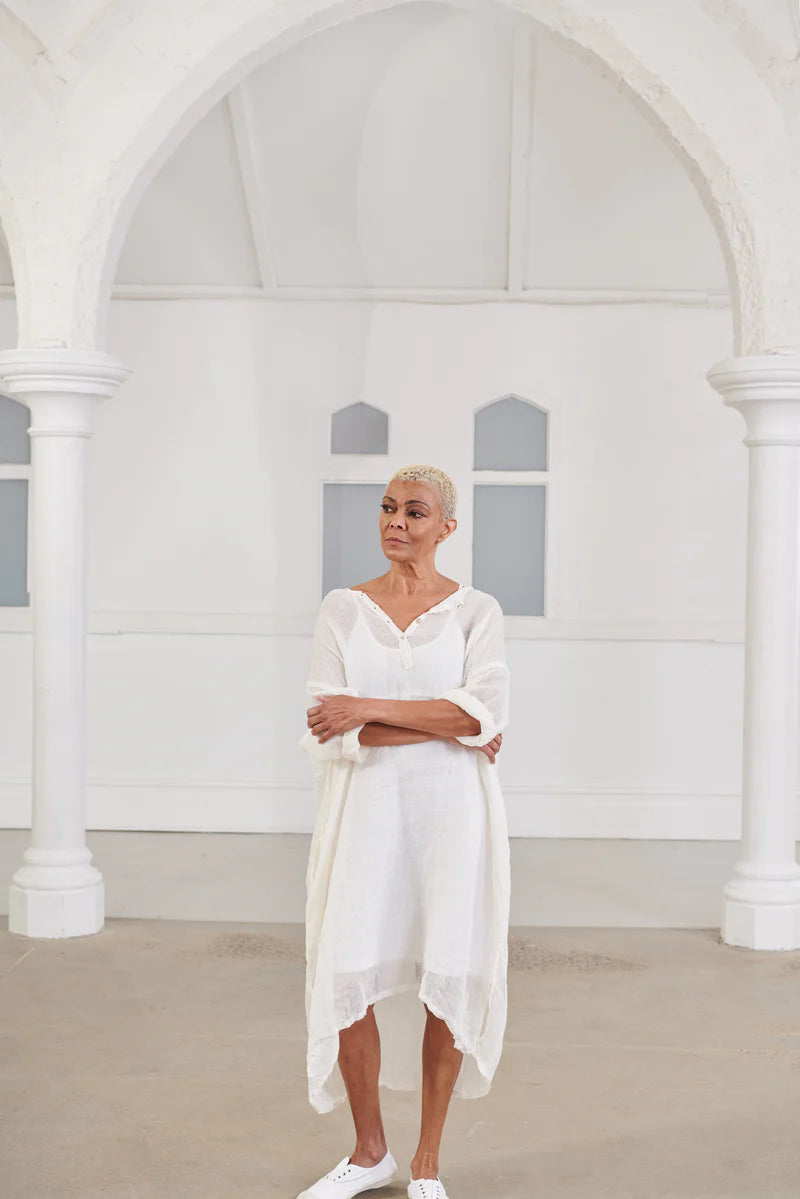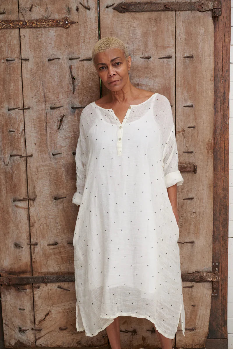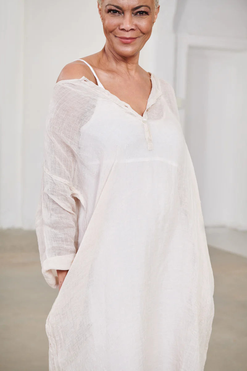 Our Hadley Dress is made from a lightweight gauze linen. The style of dress is designed to be worn oversized for a relaxed look. Hadley features side pockets and double stitching. Mother of pearl buttons add dimension and accent the neckline for an effortlessly elegant look.