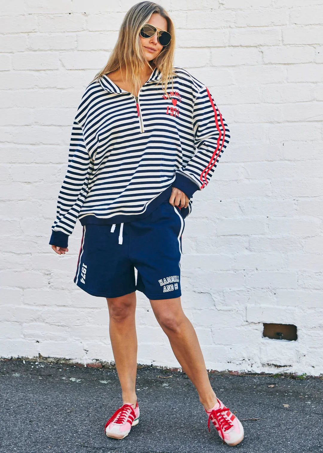 She's got that cool, old-school sports feel but reworked so it’s super wearable now. The navy and white stripes are classic, then you’ve got those contrast red sleeve stripes for that real retro pop.
