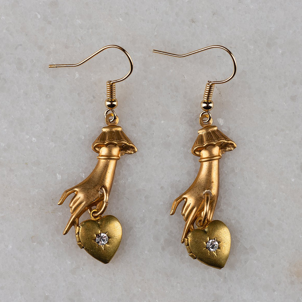"You hold my heart in your hands" earrings are just beautiful. A vintage victorian hand elegantly holds a stunning tiny heart locket with sweet diamante' The locket does open and you can pop a keepsake in there if you wish. These romantic earrings are light and easy to wear with 18 carat gold plated earwires, they will keep the most sensitive ear lobes happy!