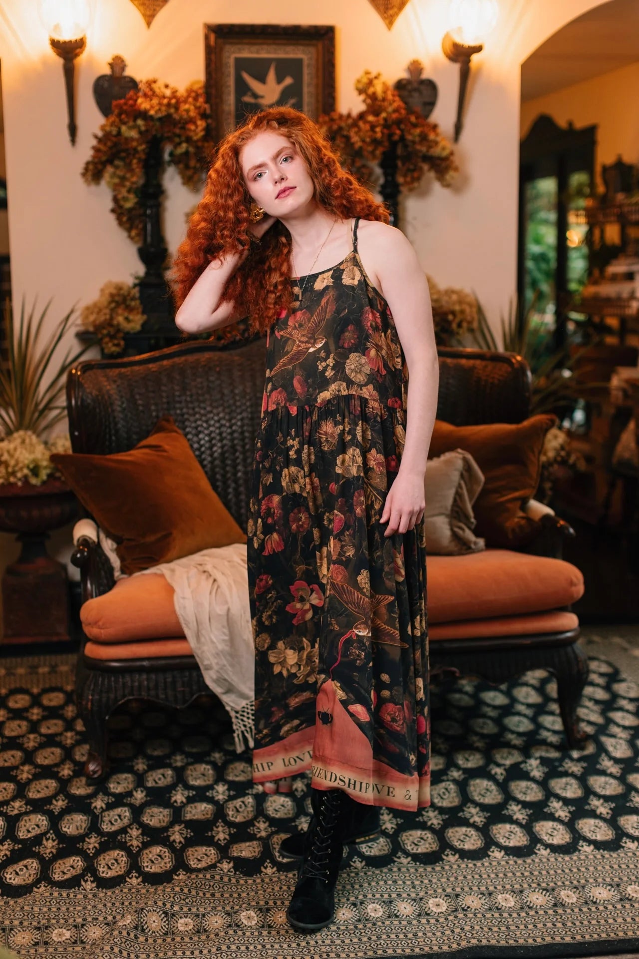 Introducing Heart of Gold — our beautiful & dramatic new collection that celebrates the bonds in our lives that endure — love, truth, and loyal friends! Designed using an intricate collage of antique artwork, it features hand-painted swallows from an 1865 scrapbook, floral wreaths by artist Karel Batist done in the 1600s, and a very special sacred heart from Notre Dame in France, which was embroidered with gilded thread and completed in 1872. This print is rich in history, but also in meaning. The two swallows with wings outstretched (traditional symbols of loyalty) carry a ribbon between them as a reminder that even across distances, those we love will always be a part of us. The vintage banner, pulled from a Victorian-era painted sign, proudly displays the motto “friendship, love, and truth”: a simple but significant declaration of what truly matters — the threads that tie us to each other, the loyalty that stands the test of time, and the love that makes it all worth it.