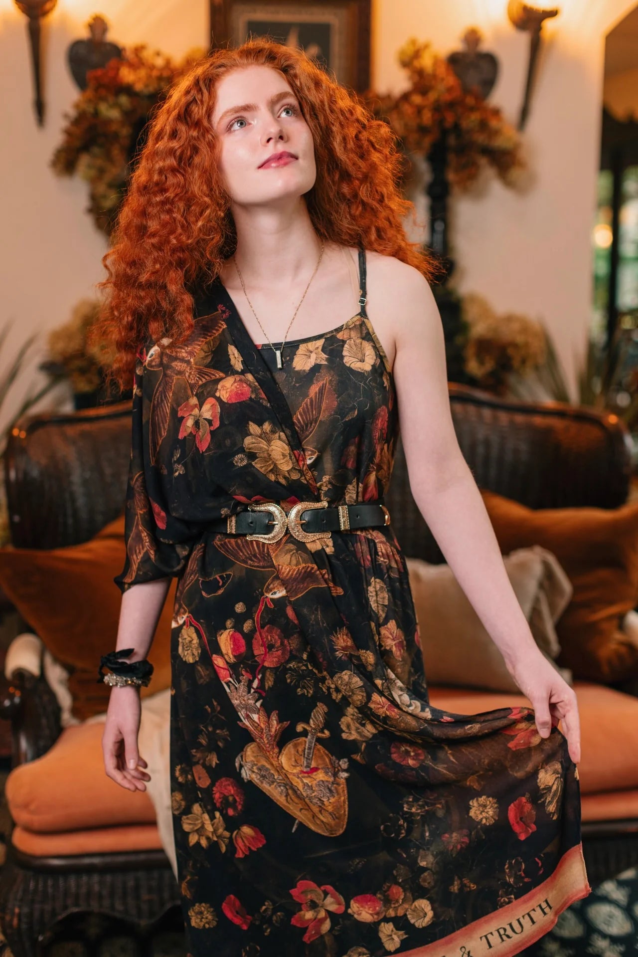 Introducing Heart of Gold — our beautiful & dramatic new collection that celebrates the bonds in our lives that endure — love, truth, and loyal friends! Designed using an intricate collage of antique artwork, it features hand-painted swallows from an 1865 scrapbook, floral wreaths by artist Karel Batist done in the 1600s, and a very special sacred heart from Notre Dame in France, which was embroidered with gilded thread and completed in 1872. This print is rich in history, but also in meaning. The two swallows with wings outstretched (traditional symbols of loyalty) carry a ribbon between them as a reminder that even across distances, those we love will always be a part of us. The vintage banner, pulled from a Victorian-era painted sign, proudly displays the motto “friendship, love, and truth”: a simple but significant declaration of what truly matters—the threads that tie us to each other, the loyalty that stands the test of time, and the love that makes it all worth it.