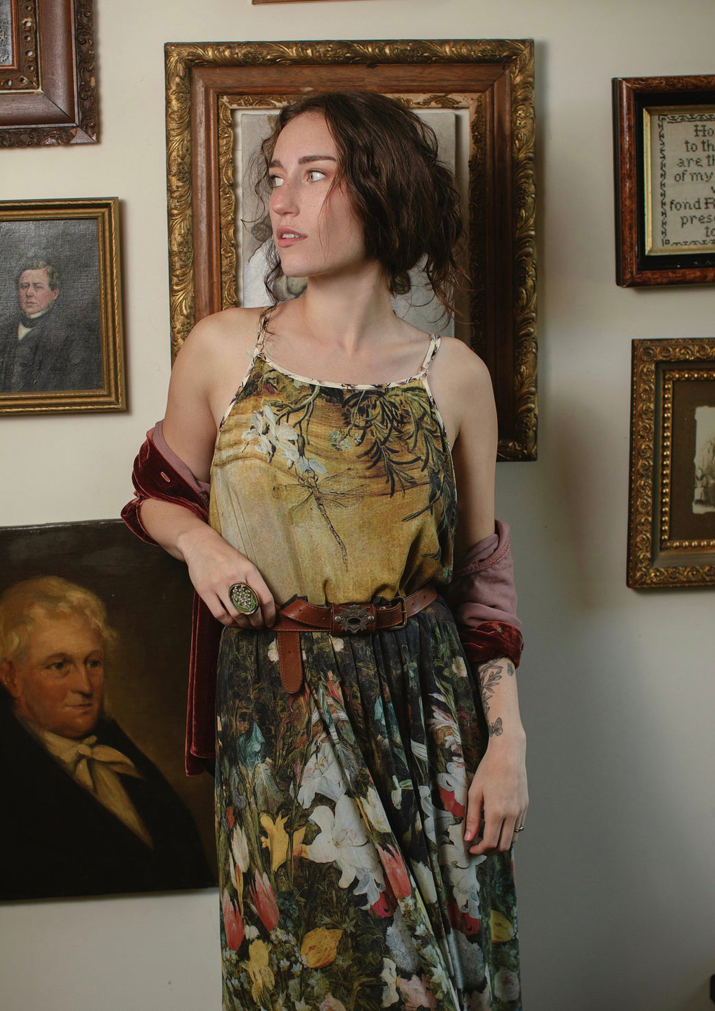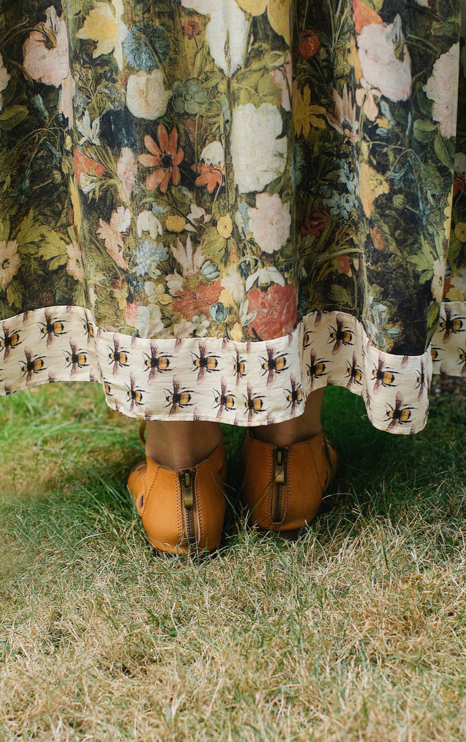 Sometimes — while oftentimes actually if we’re being honest — we design a piece for the purely selfish reason that we want to wear it ourselves ;) The I Dream in Flowers dress was definitely one of these pieces — created using a masterful floral oil painting from the early 1600’s by artist Jan Brueghel, and trimmed with an ink drawing of bumblebees found in a Victorian insect encyclopedia. It has the look and feel of a timeless, vintage piece that will never go out of style.