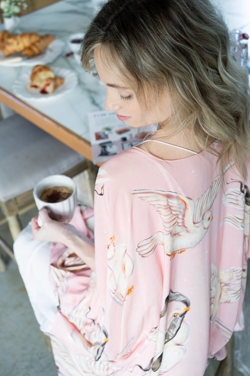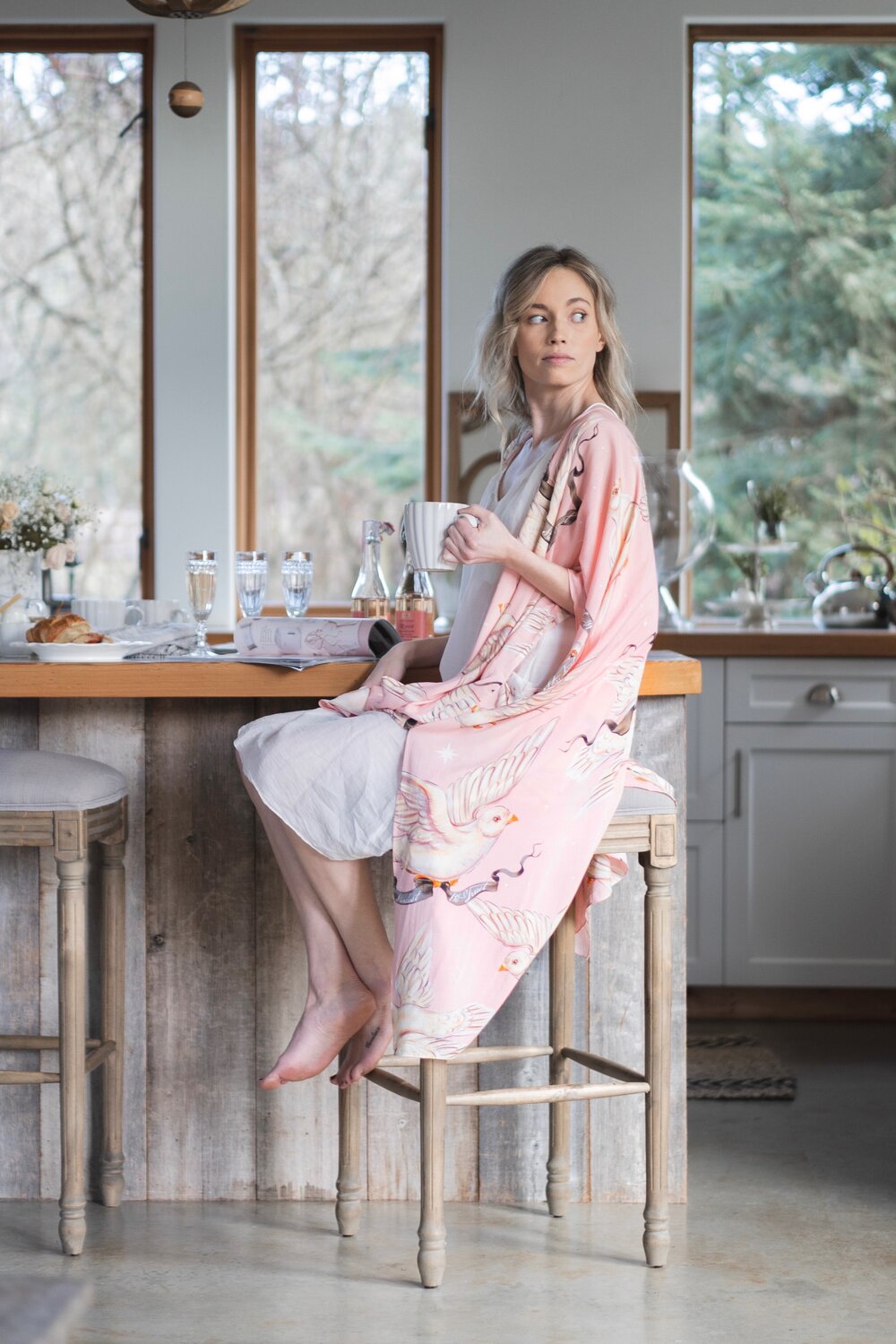 The artwork on this stunning kimono was custom painted by Vancouver Island artist Kat Cearns, and based on doves from original antique Victorian prints. Images of doves are symbols of faith, hope and peace — and they were believed by the Victorians to bring luck when worn on jewelry or embroidered on clothing. Each of our doves carry a flowing banner reading “In Stardust We Trust”