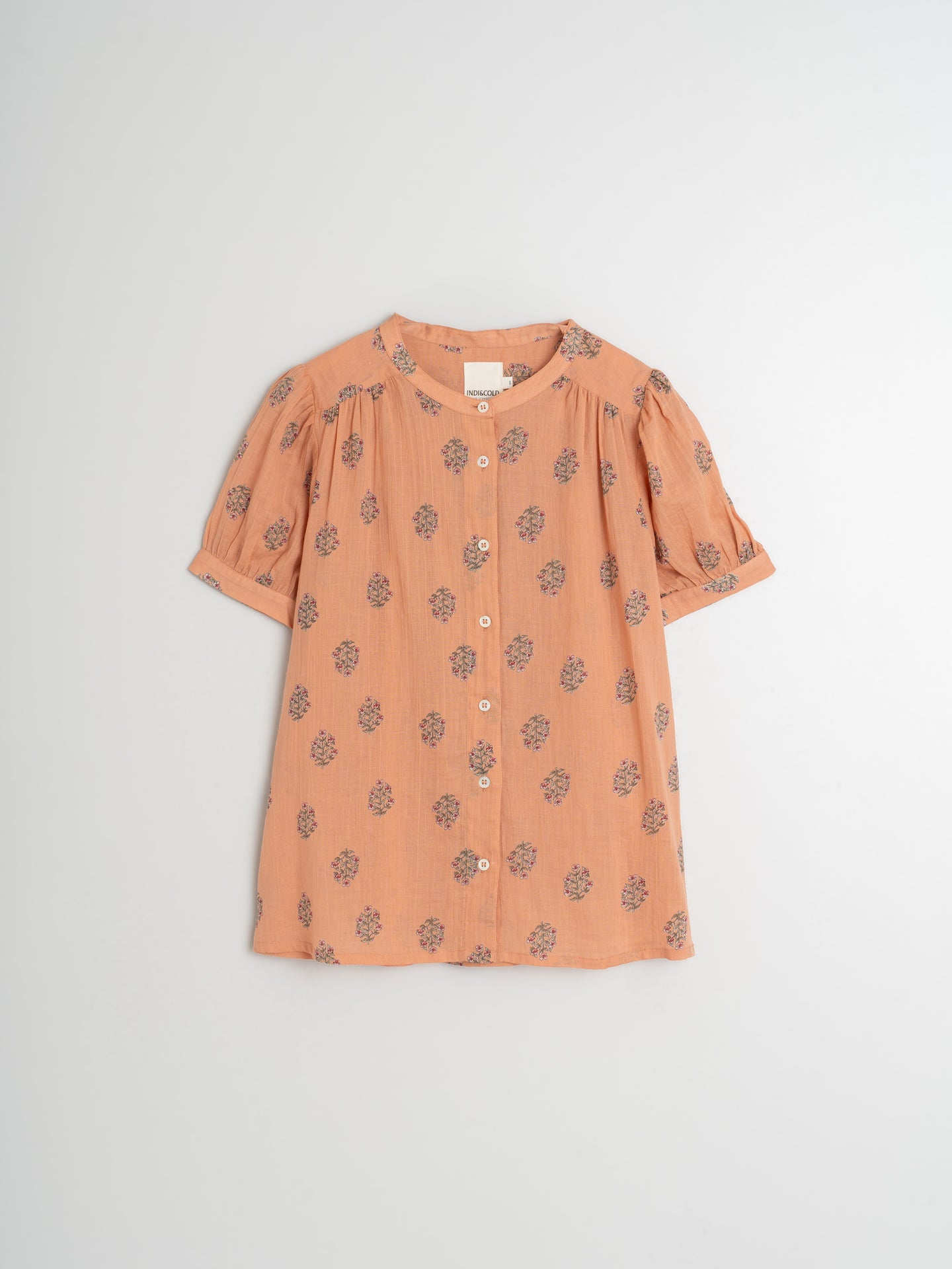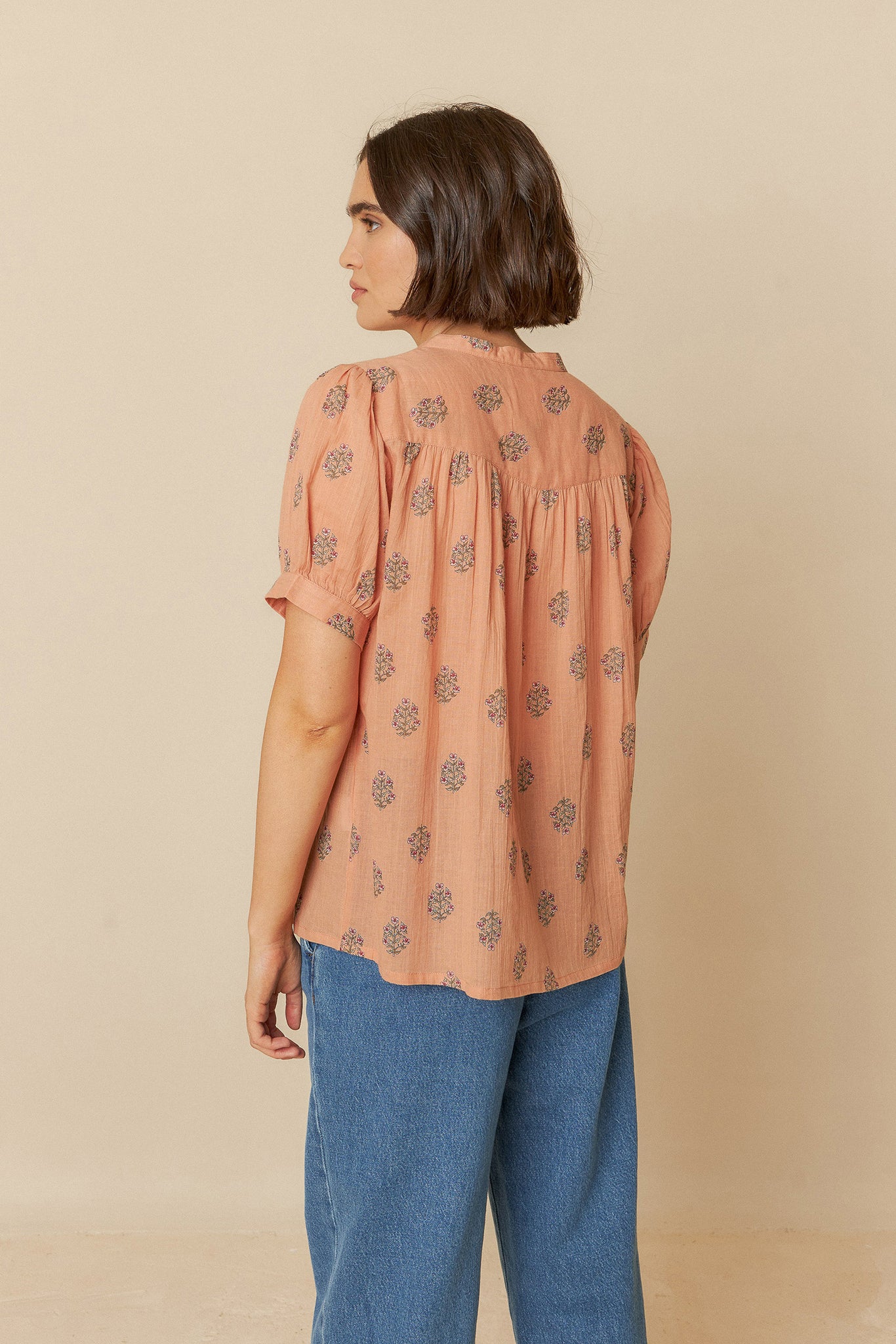 We love square-cut shirts. This one has a box collar and short puffed sleeves, plus a fluid silhouette printed in cotton voile for the hottest days.