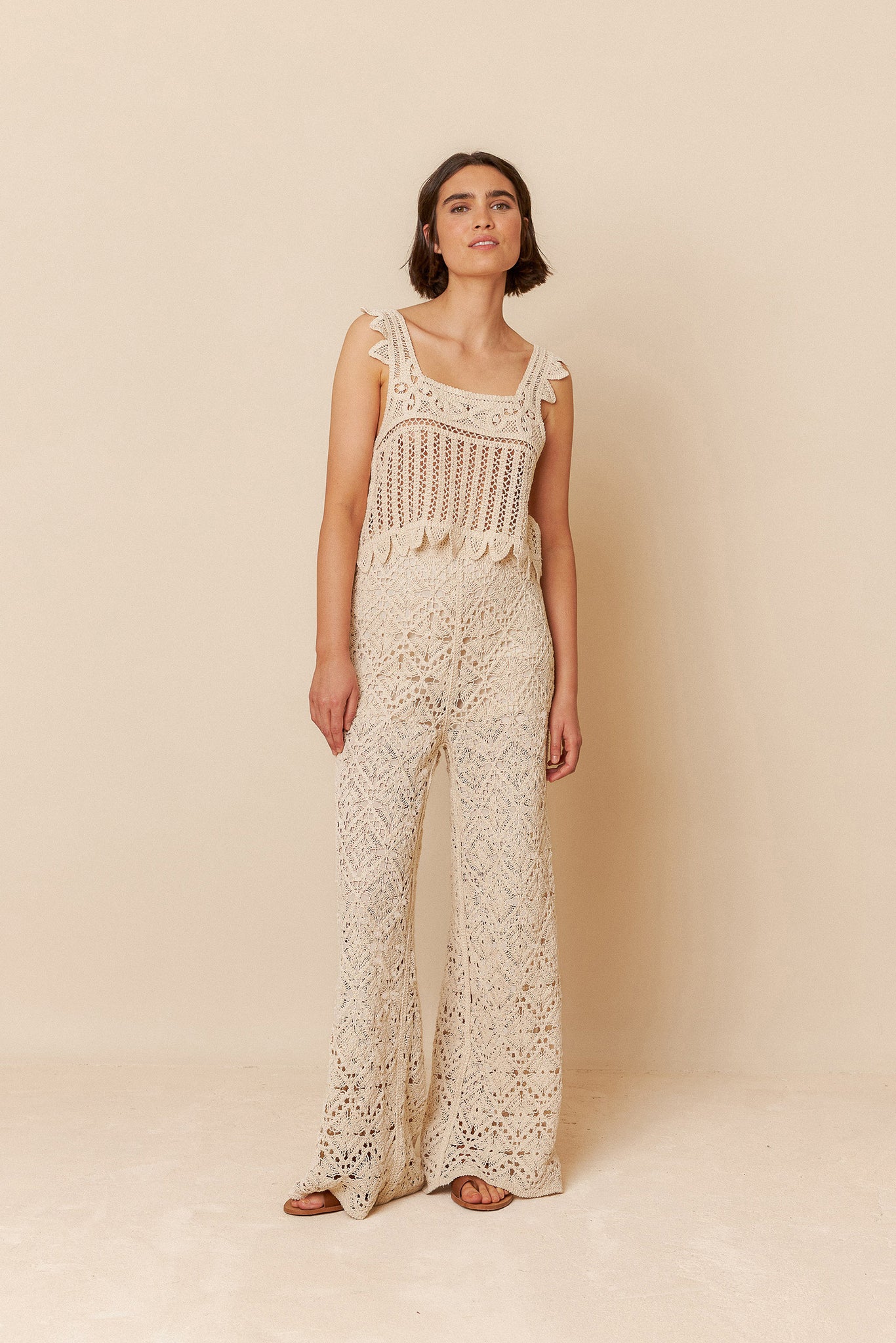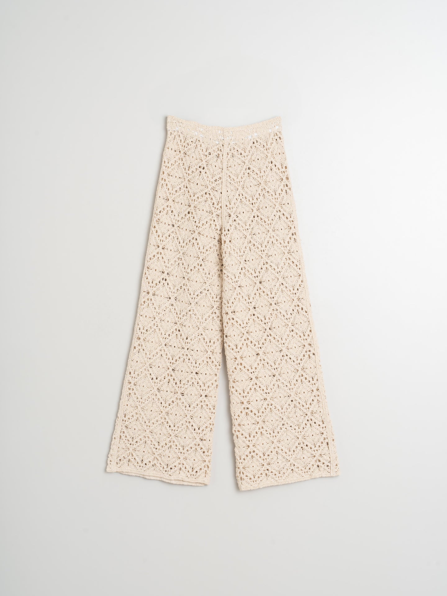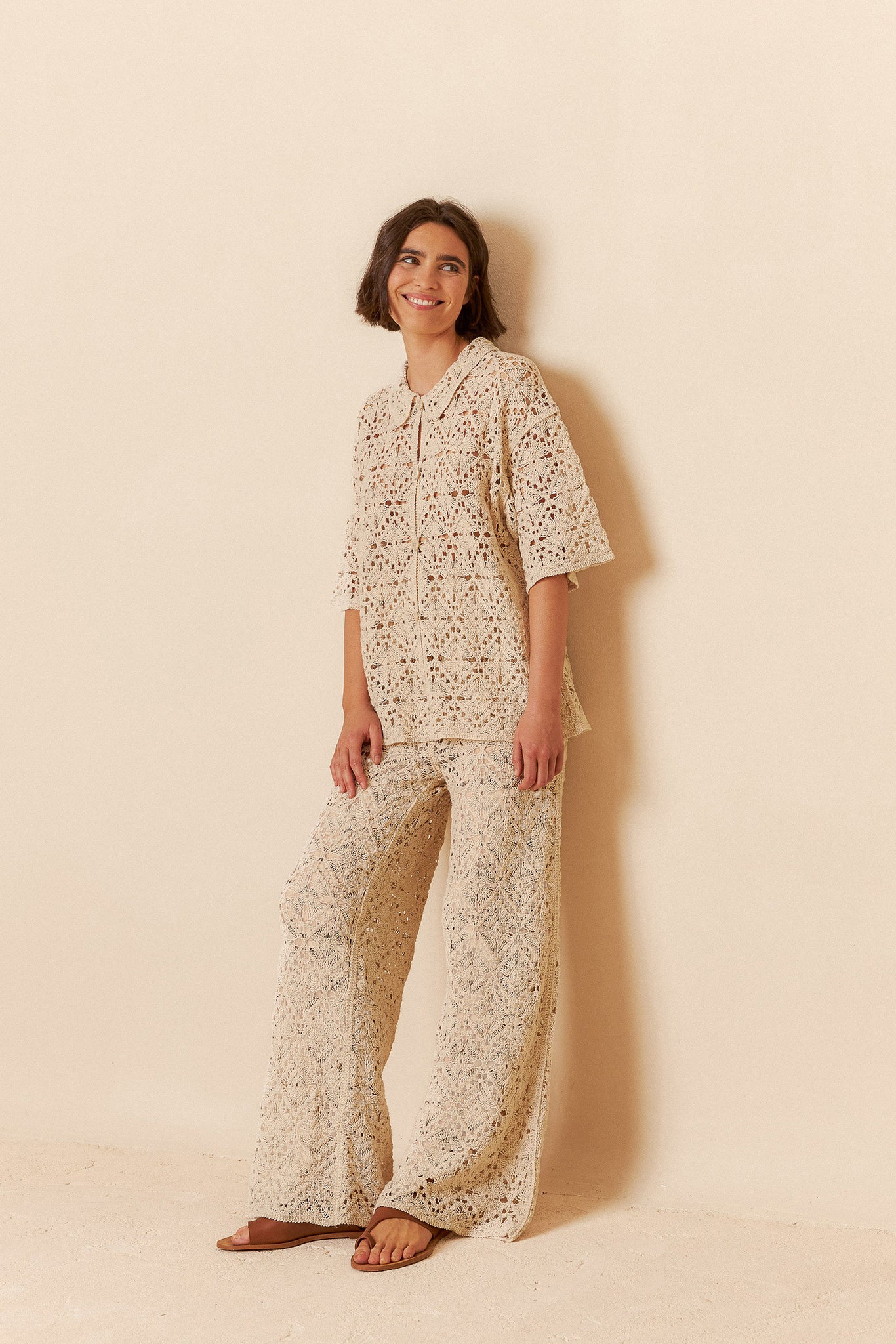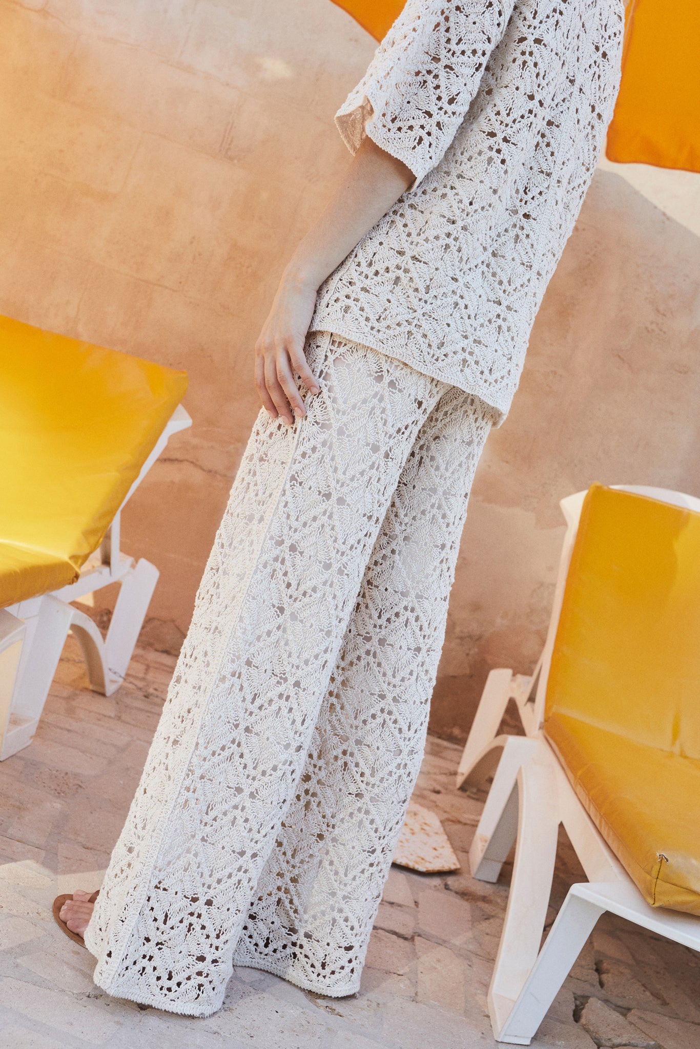 Our crochet pants with a geometric motif have a high waist with elastic waistband and wide leg, short lining and relaxed fit. You can combine them with the matching jacket or crop top for a total crochet look ;)