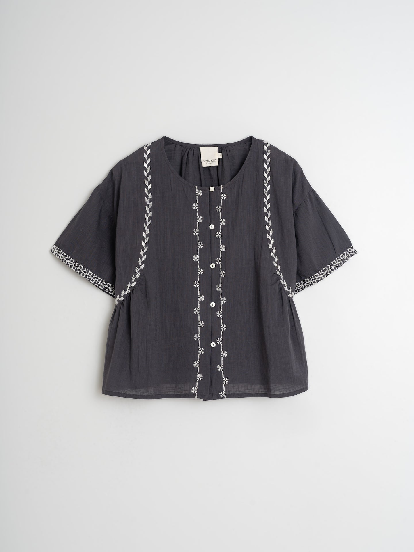 This shirt has a trapeze cut, and we love it. It has geometric motifs embroidered in cross stitch and has a square, slightly short fit.