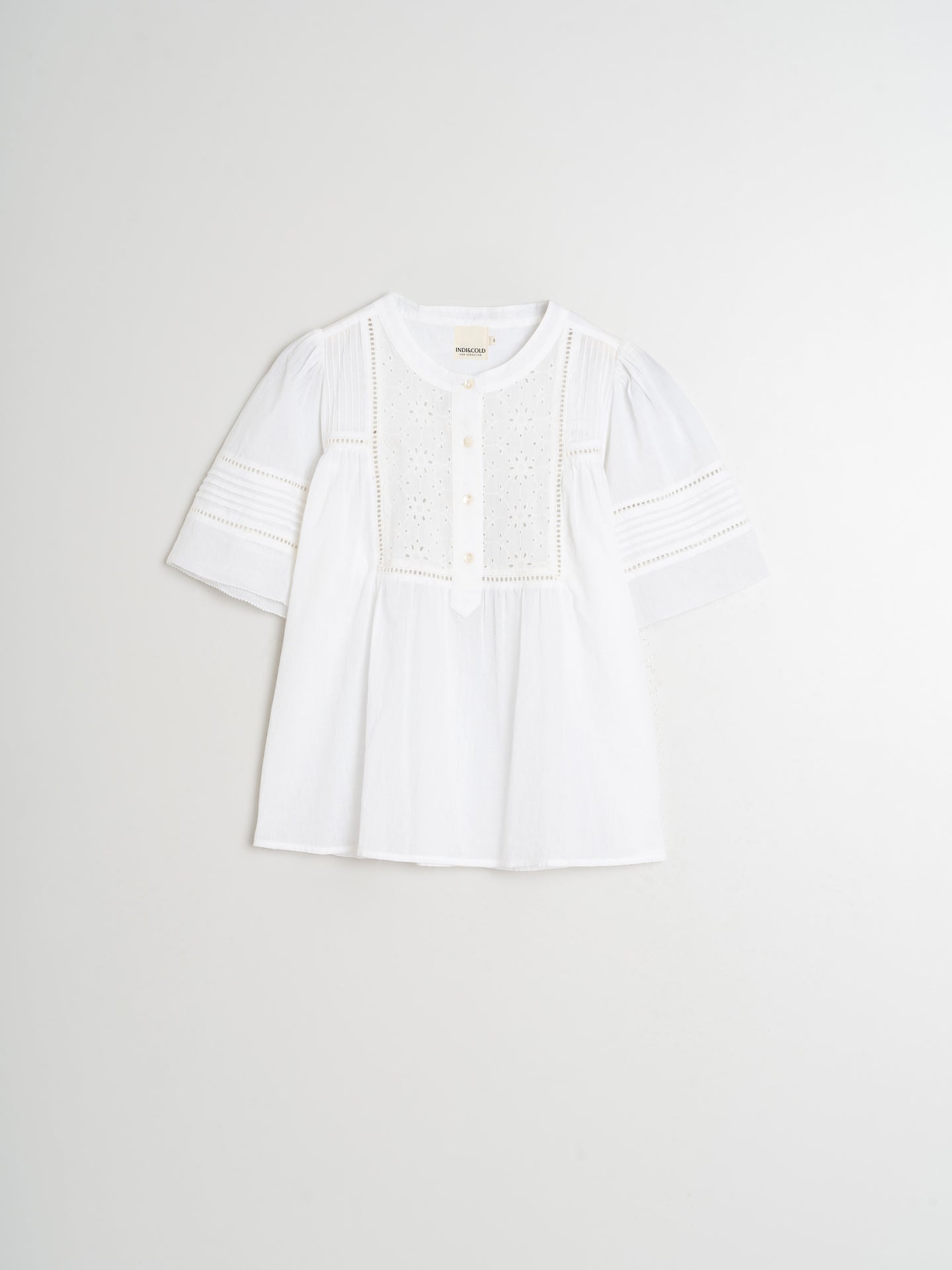 With a delicate design, this cotton voile blouse features short, slightly puffed sleeves and a half-placket buttoned closure. Floral embroidery, made with pintucks and ladder lace details, adds a handcrafted touch that enhances the garment. Its regular fit ensures comfort throughout the day, making it a perfect choice.