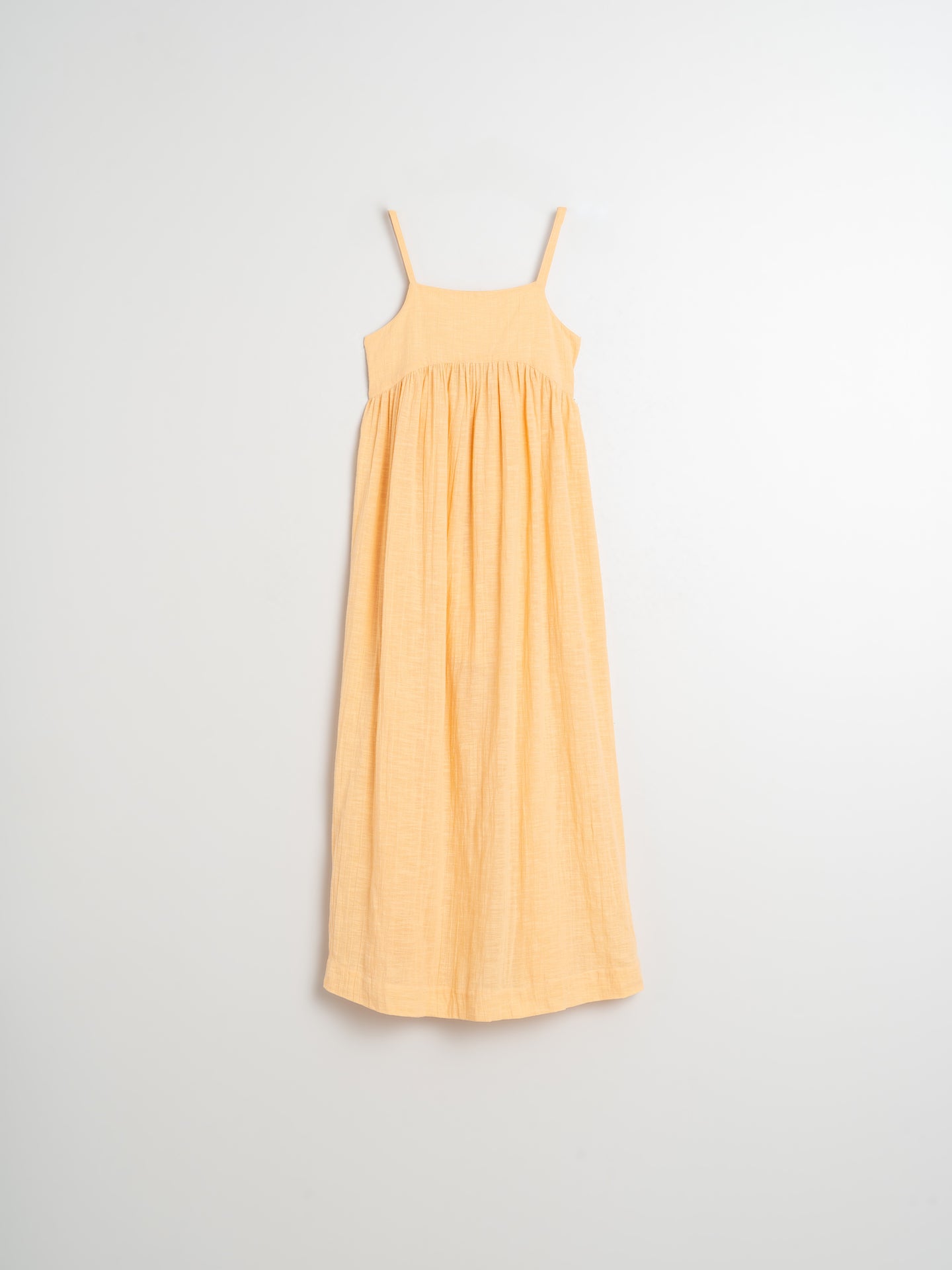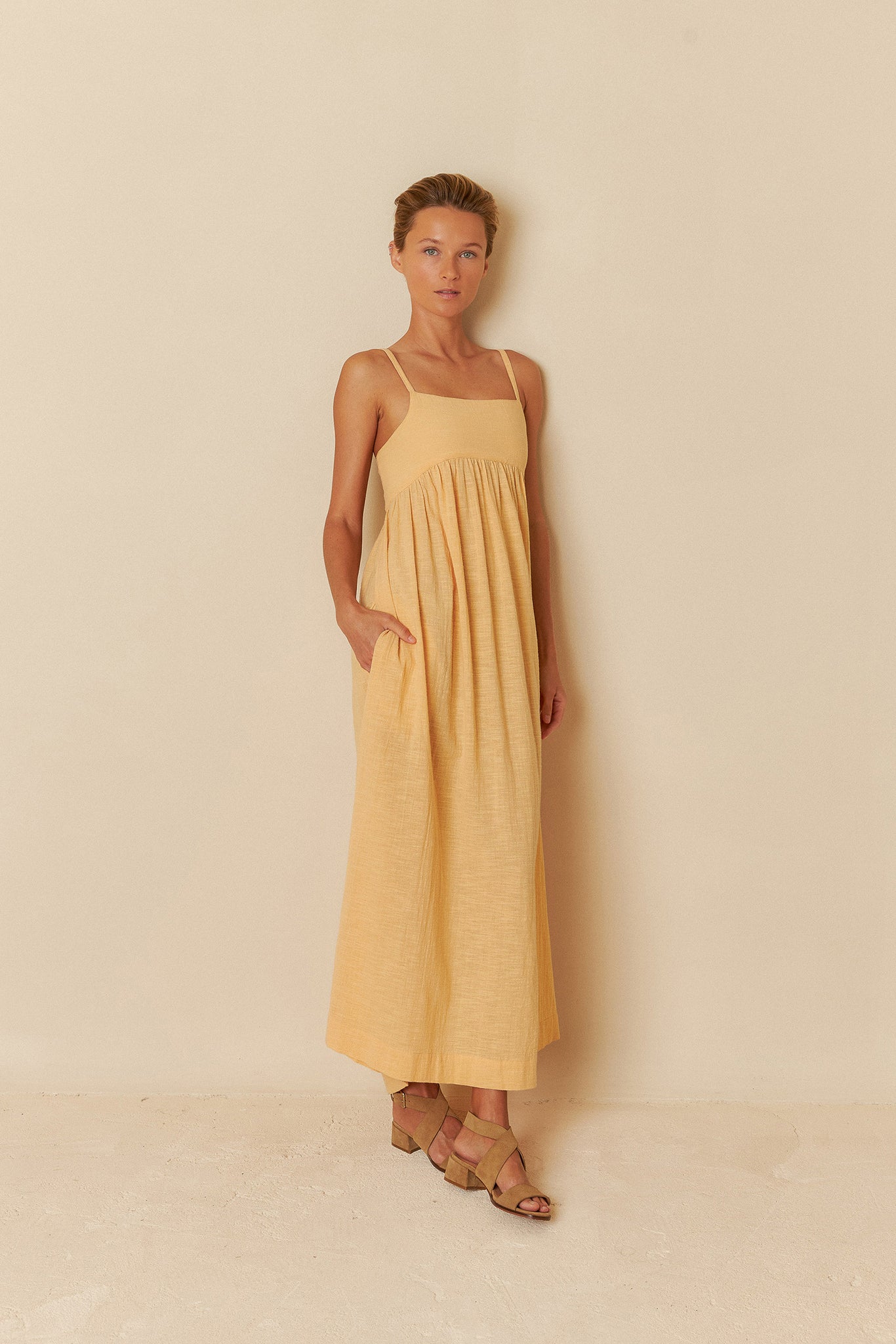This is the dress you were looking for. Our maxi dress with straps is made of organic cotton, has an empire cut with a bow on the back and hidden side pockets.