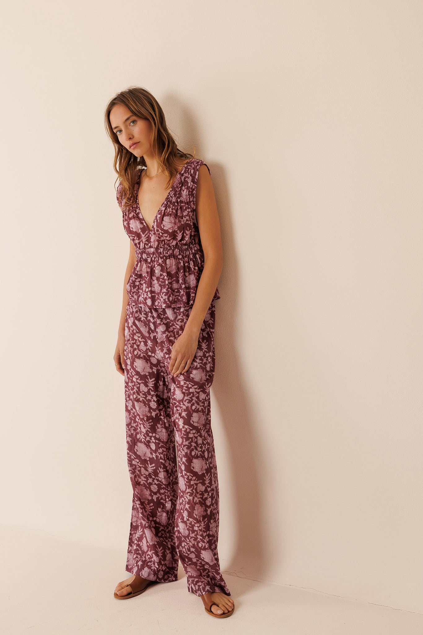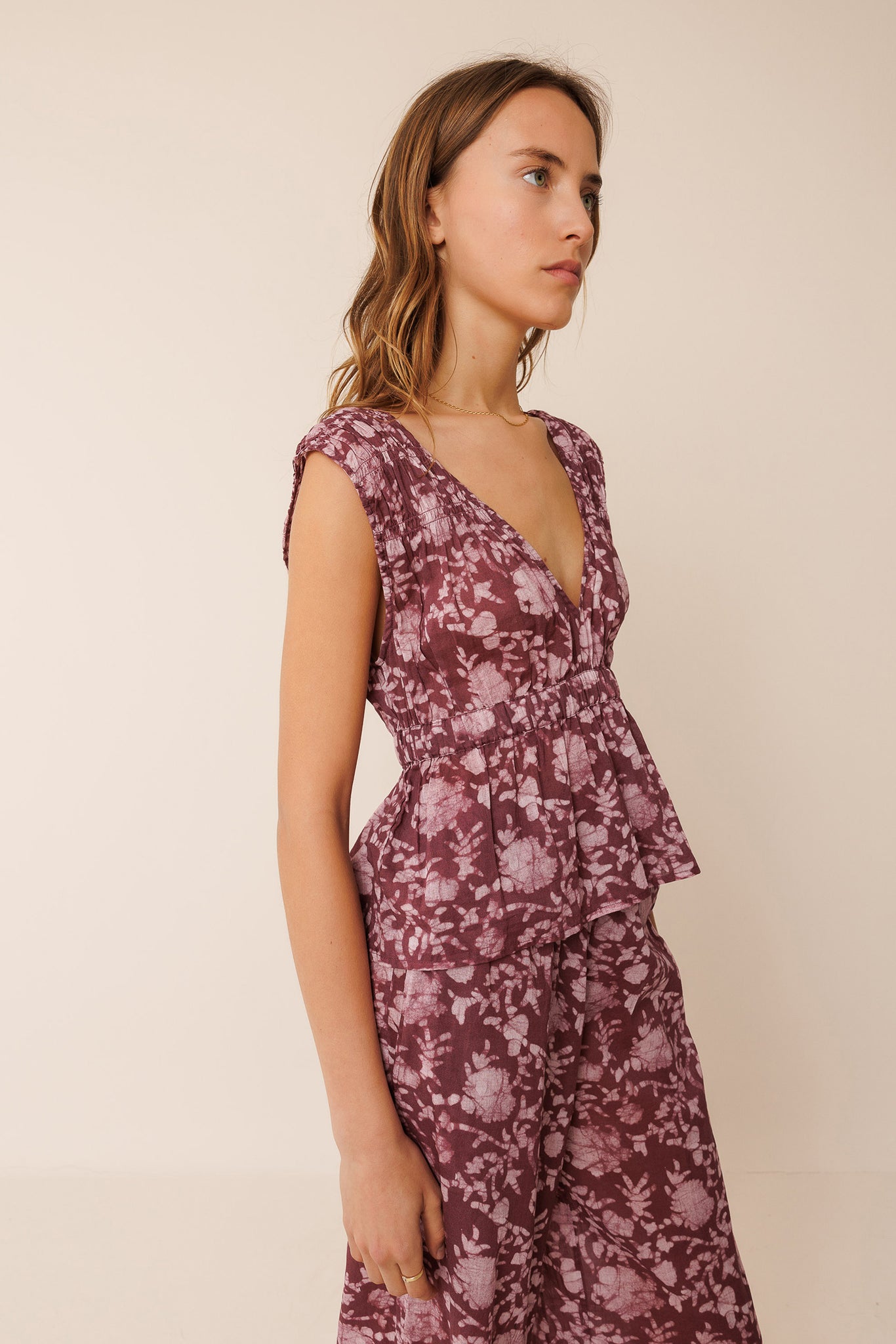V-neck top with elastic details on the chest and waist on a printed cotton voile fabric. This super feminine silhouette is perfect to combine with flowing pants.