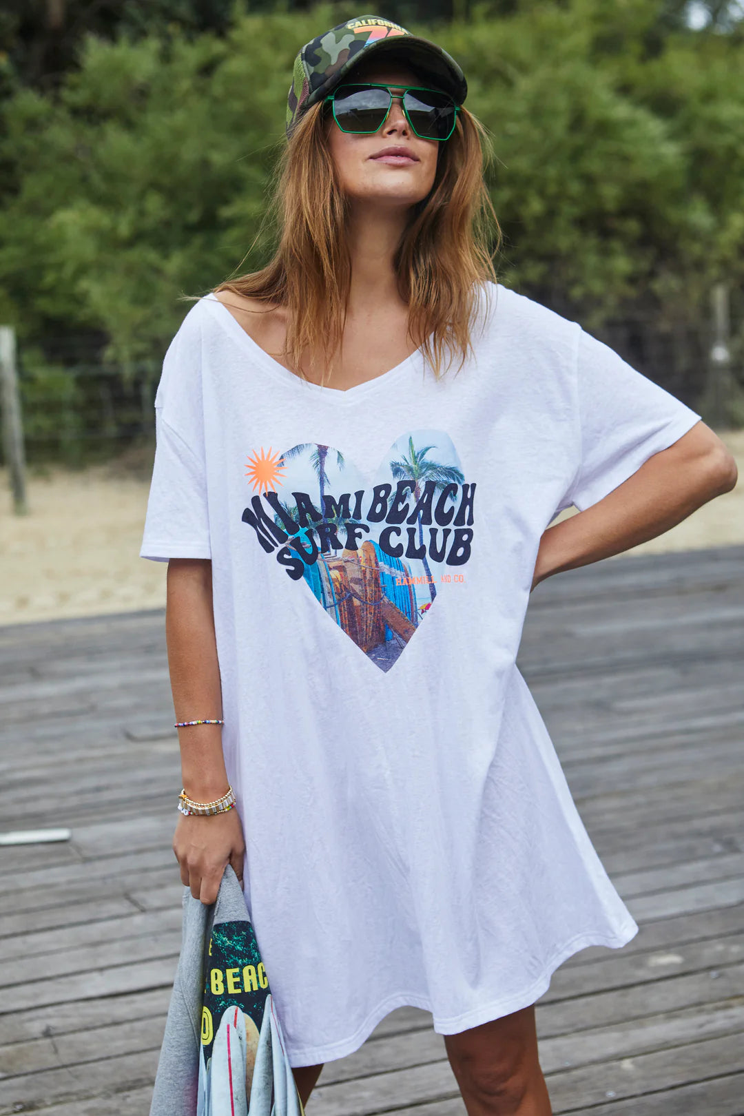 New marle summer tee dress with front print. This dress is the same great fit as our slouchy V neck tee with added length as a cool beach dress over your swimmers!