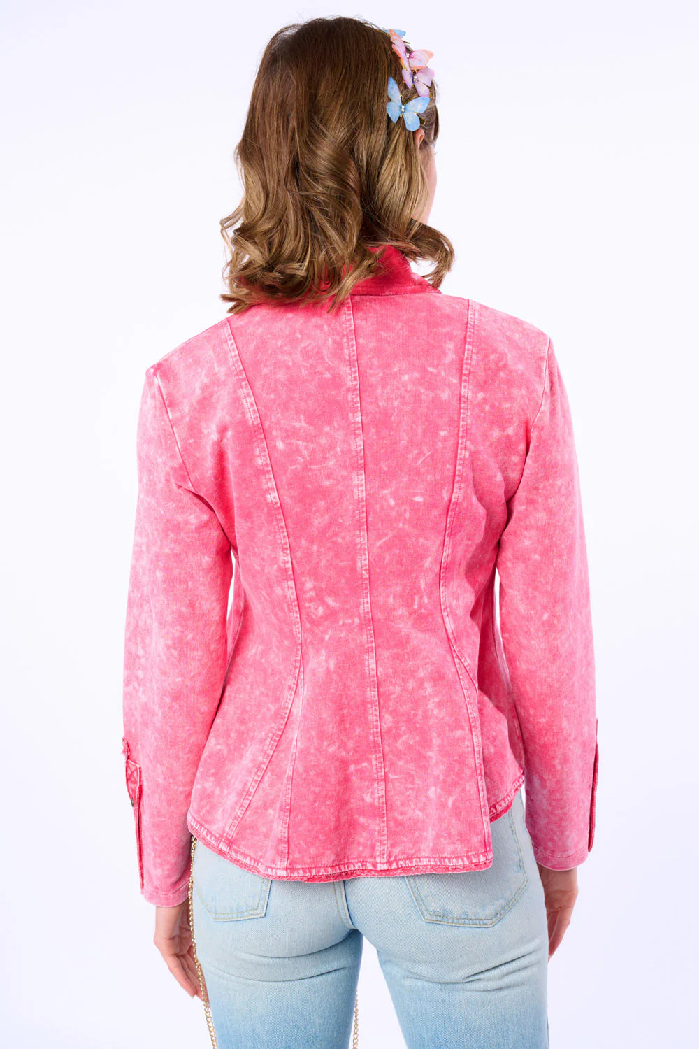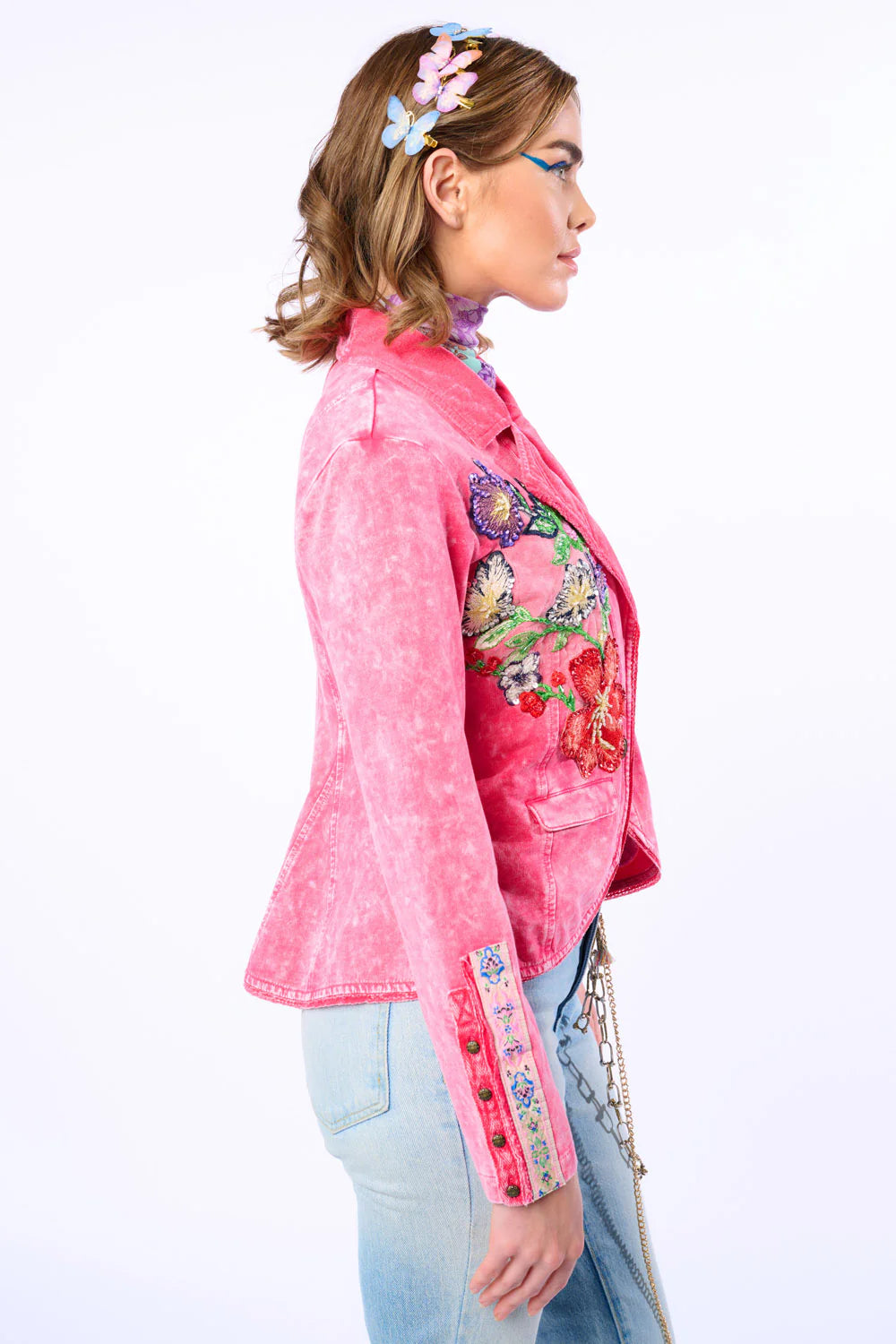 * ED25F625 * Washed French terry button-up blazer, embroidered trim sewn on the sleeves, sequin embroidered floral patches sewn on the front, lapel pinned with crystal wasp brooch, 2 front flap pockets, 2 front buttons * Vintage blue * Dry clean * Self fabric: 100% cotton, contrast: 94% polyester, 6% spandex
