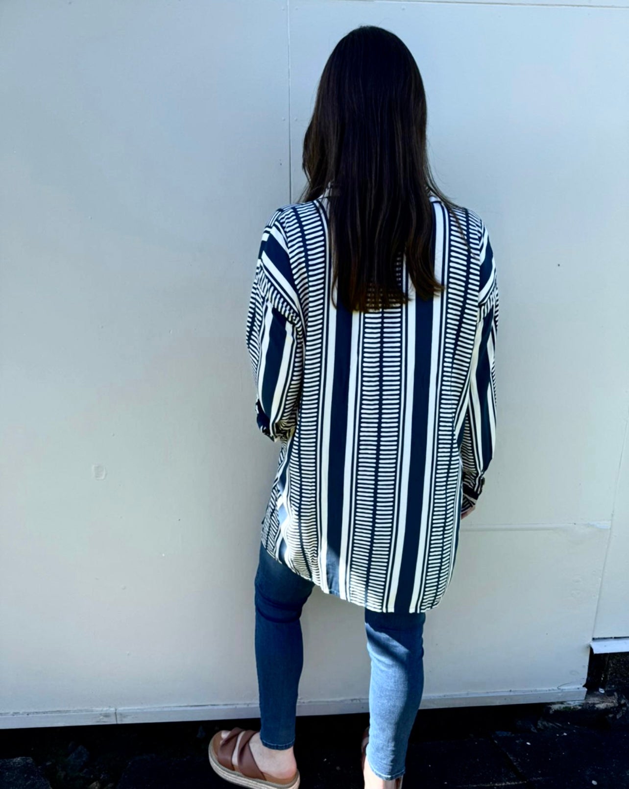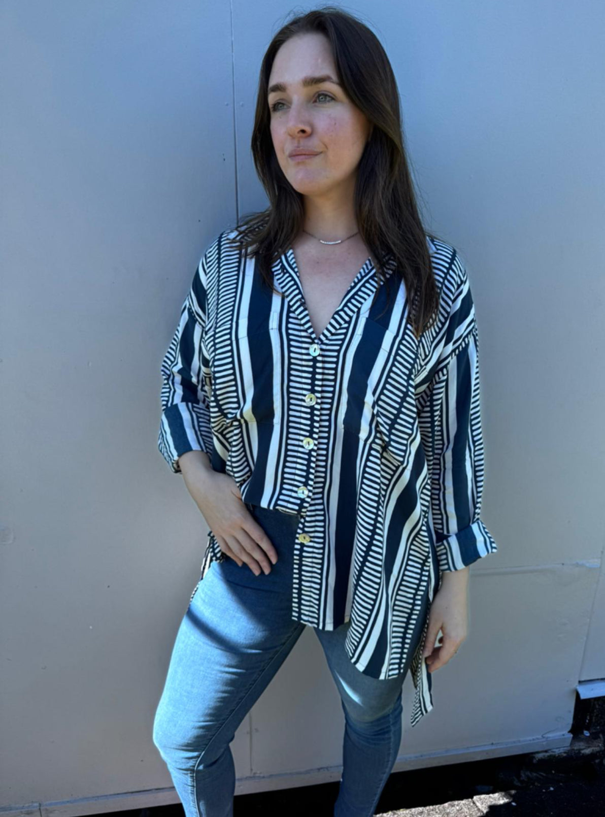 Loose fitting extremely versatile long sleeved oversized boyfriend shirt. Featuring shell buttons, patch pockets and mullet length tailoring (short at the front, long at the back).